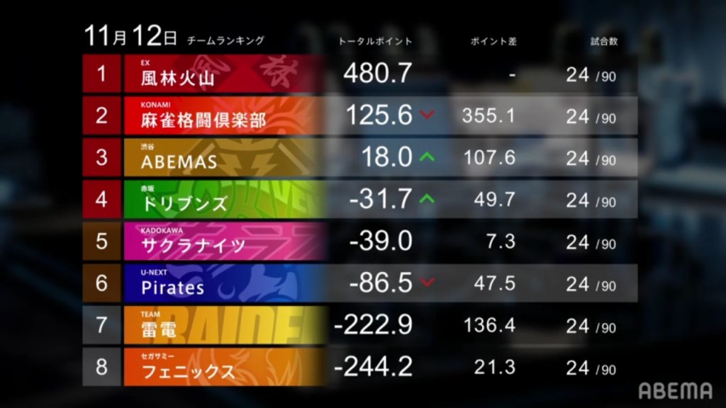 In 3rd place is the Shibuya Abemas. Despite the team getting an even record of 1/1/1/1, they got a good gain of 27.4. Leading the way were Shiratori, who got a first, and Matsumoto, who got a 40,000+ 2nd place. With the results the team went into the positives and
