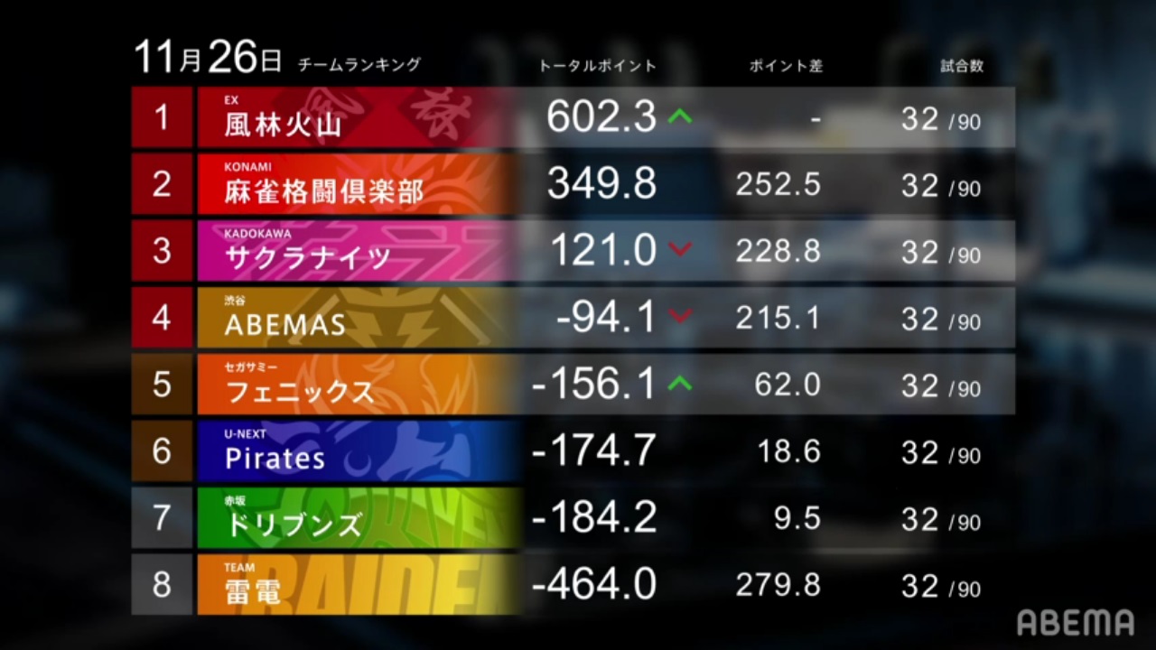 Going into negative territory, the Shibuya Abemas take 6th place in the performance rankings. Shiratori maintained his 100% last place avoidance rate by getting a 1st to start of the week, but mediocre scores from Hinata and Matsumoto caused the team to drop their 2nd week in a row. With a loss of -18.4 and a 1/1/1/1 record, the team loses ground on 3rd place.