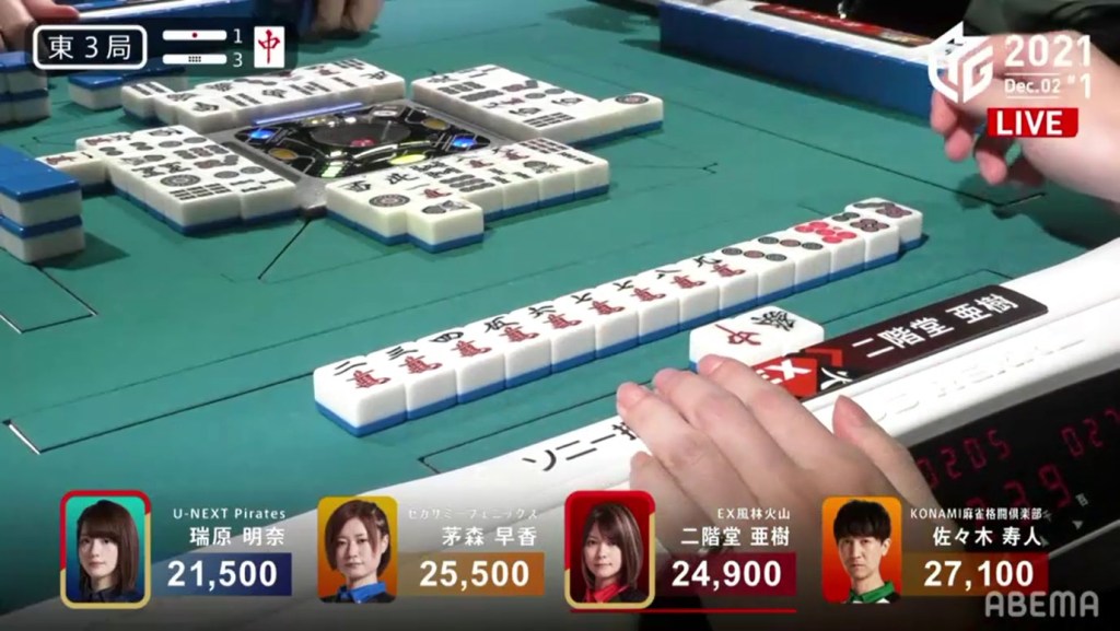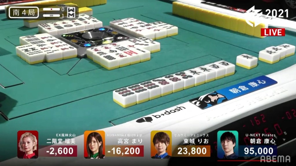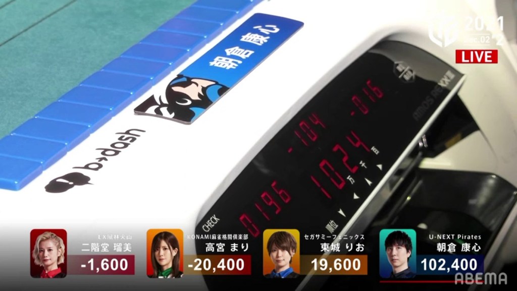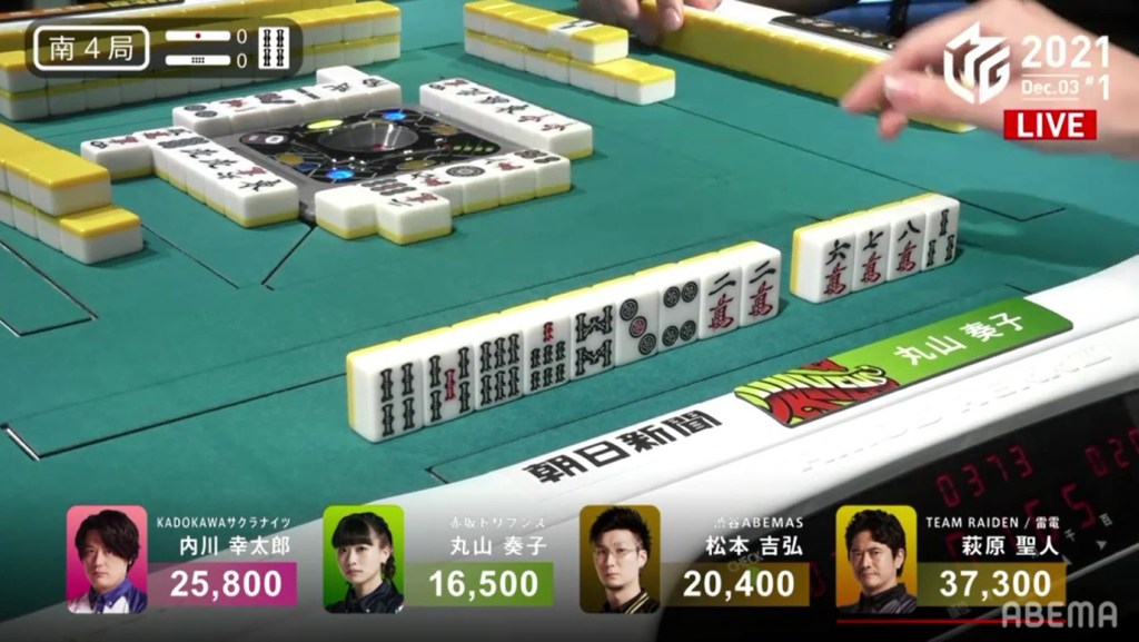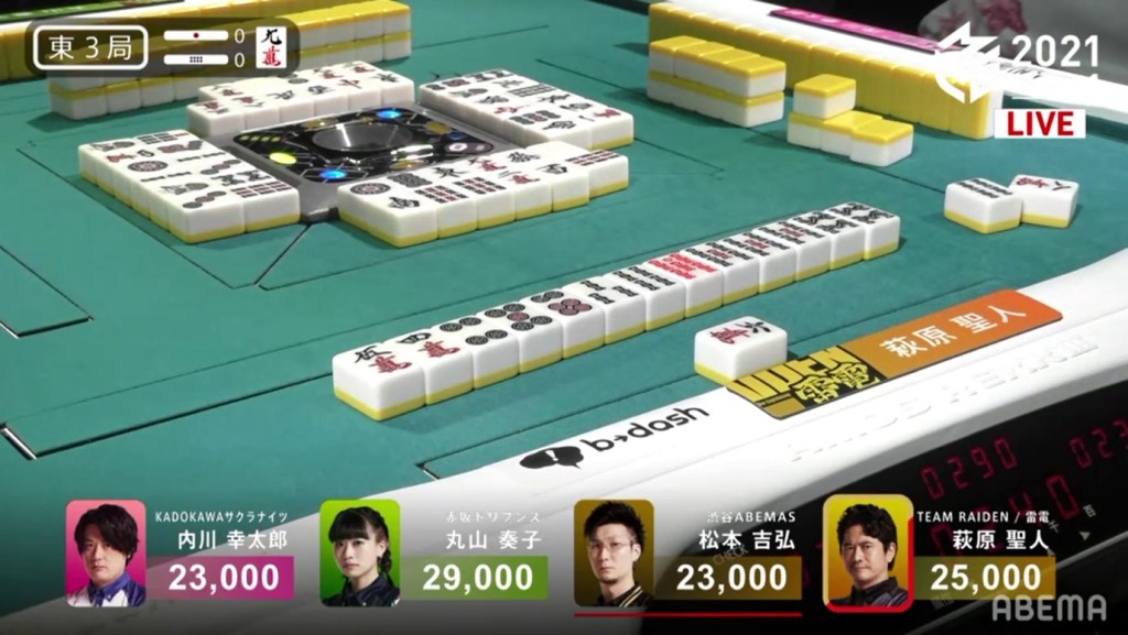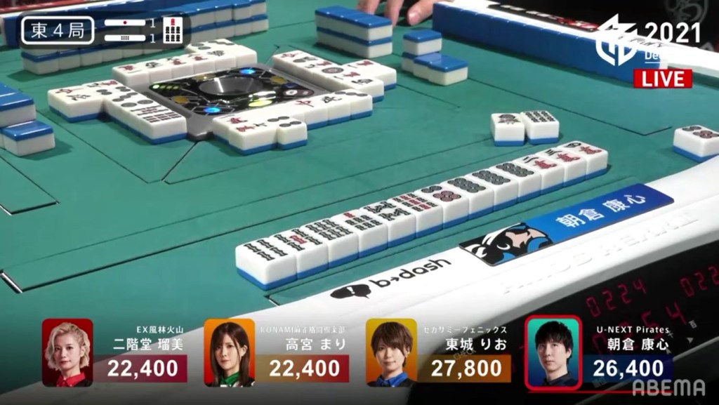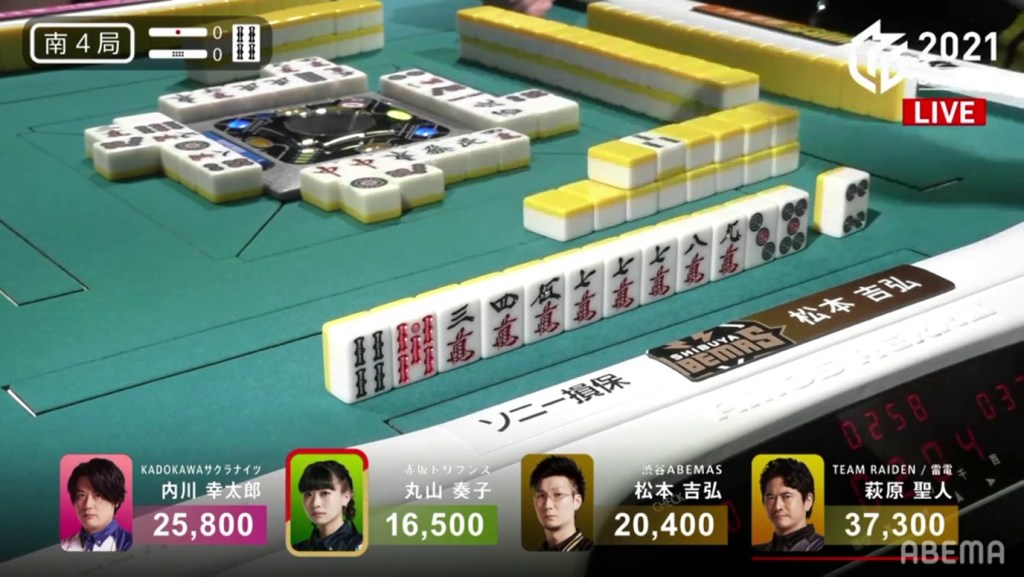 With the uradora indicator under the 3m being a 6p, it gives Kurosawa two more dora. Kurosawa wins the hand with Riichi/Iipeikou/Dora 1/Aka 1/Ura 2, just enough for a 12,000 point haneman. With a single kan from Sonoda, he turns the 5,200 hand into a 12,000 hand, loses his riichi stick and goes into the negatives in the process. As for Kurosawa, the win would move her above Sawazaki. Kurosawa would eventually go on and win the game, breaking Team Raiden’s 18-game winless streak.