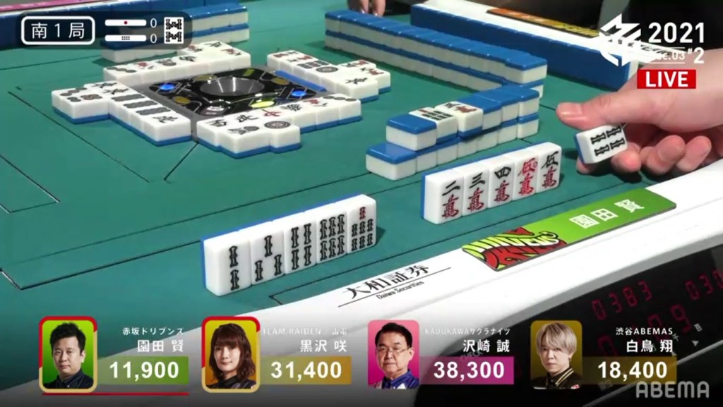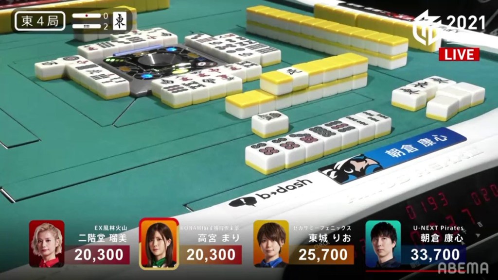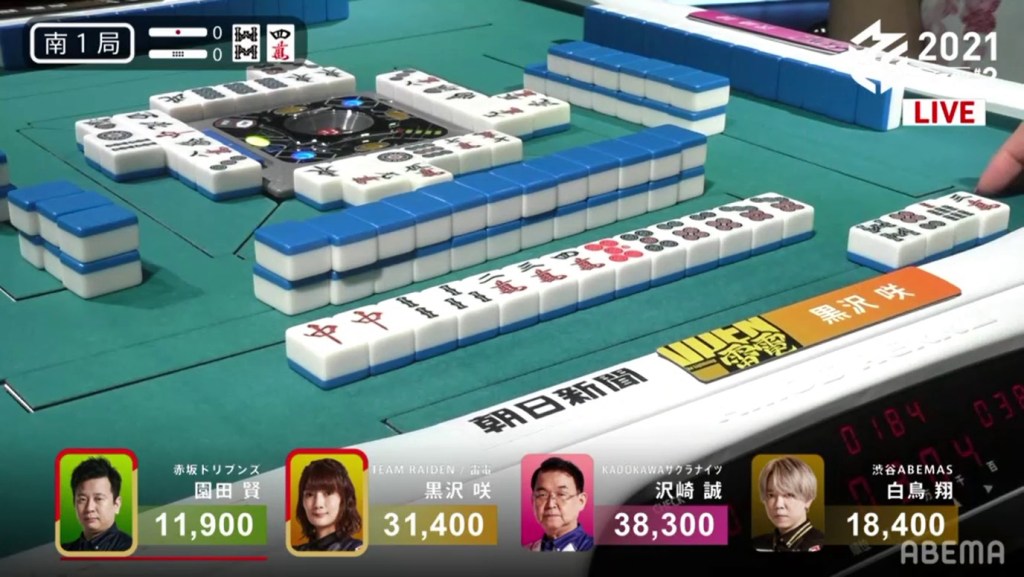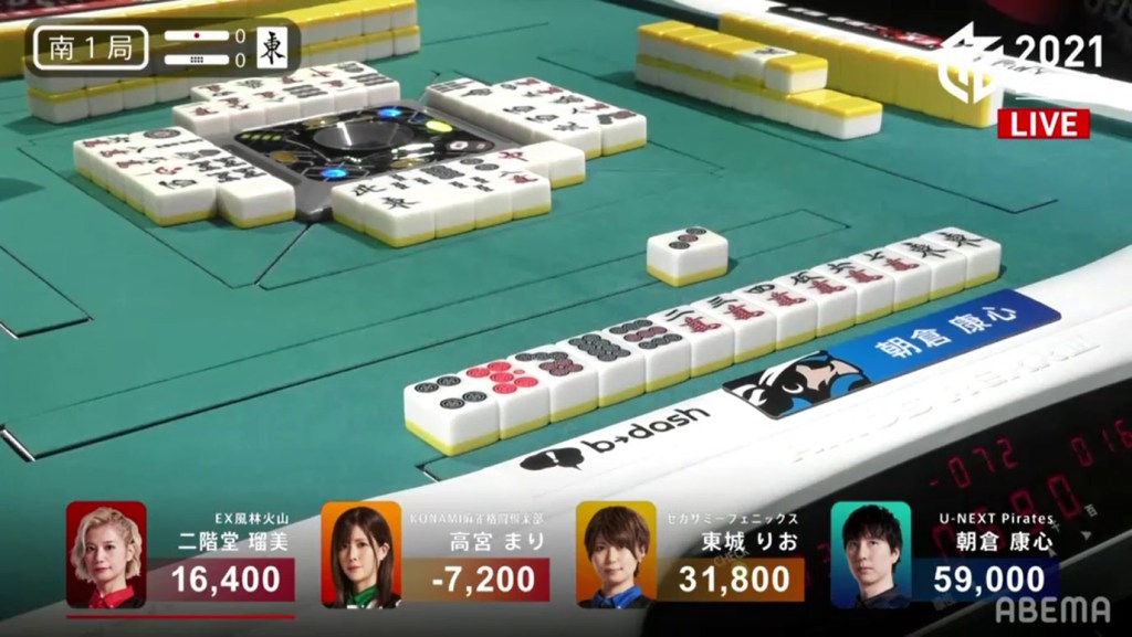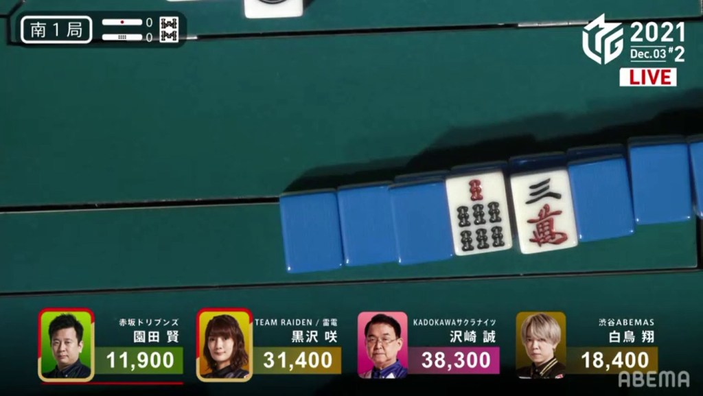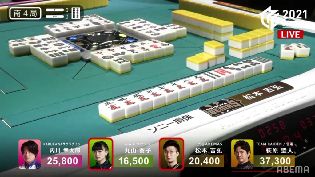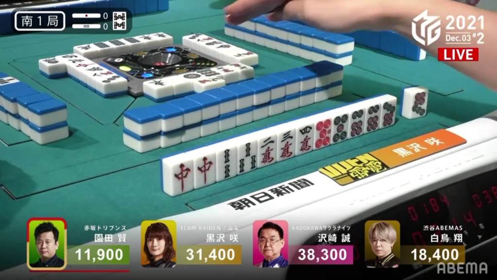 With the uradora indicator under the 3m being a 6p, it gives Kurosawa two more dora. Kurosawa wins the hand with Riichi/Iipeikou/Dora 1/Aka 1/Ura 2, just enough for a 12,000 point haneman. With a single kan from Sonoda, he turns the 5,200 hand into a 12,000 hand, loses his riichi stick and goes into the negatives in the process. As for Kurosawa, the win would move her above Sawazaki. Kurosawa would eventually go on and win the game, breaking Team Raiden’s 18-game winless streak.