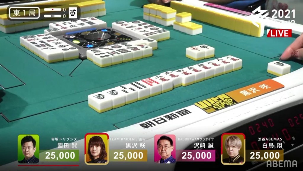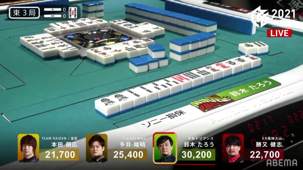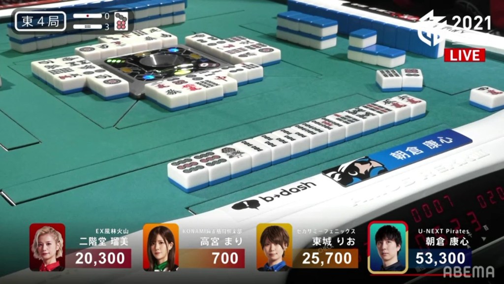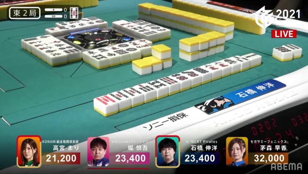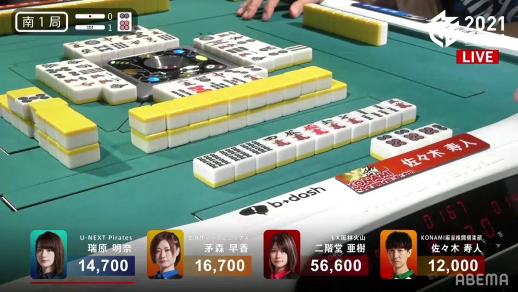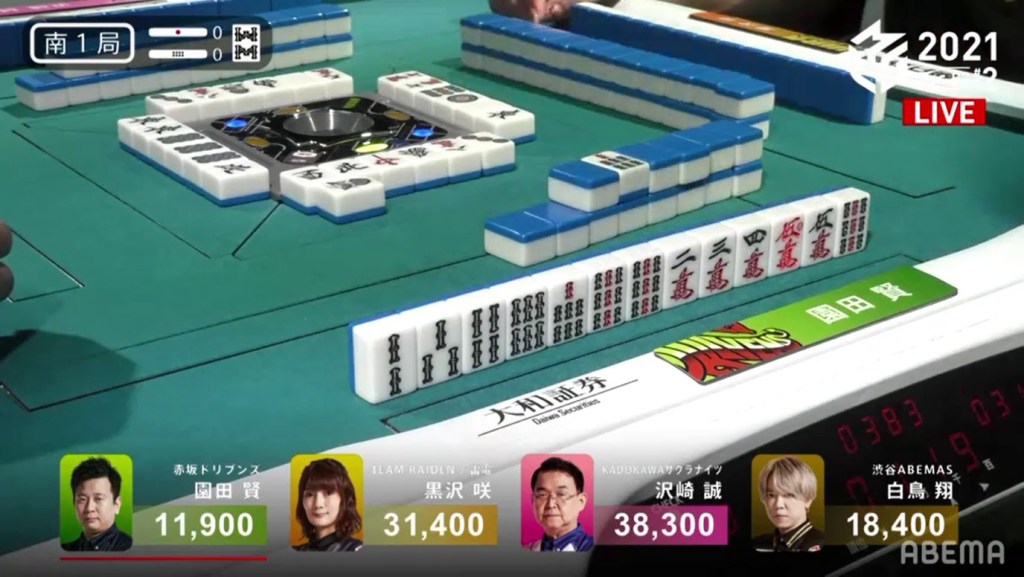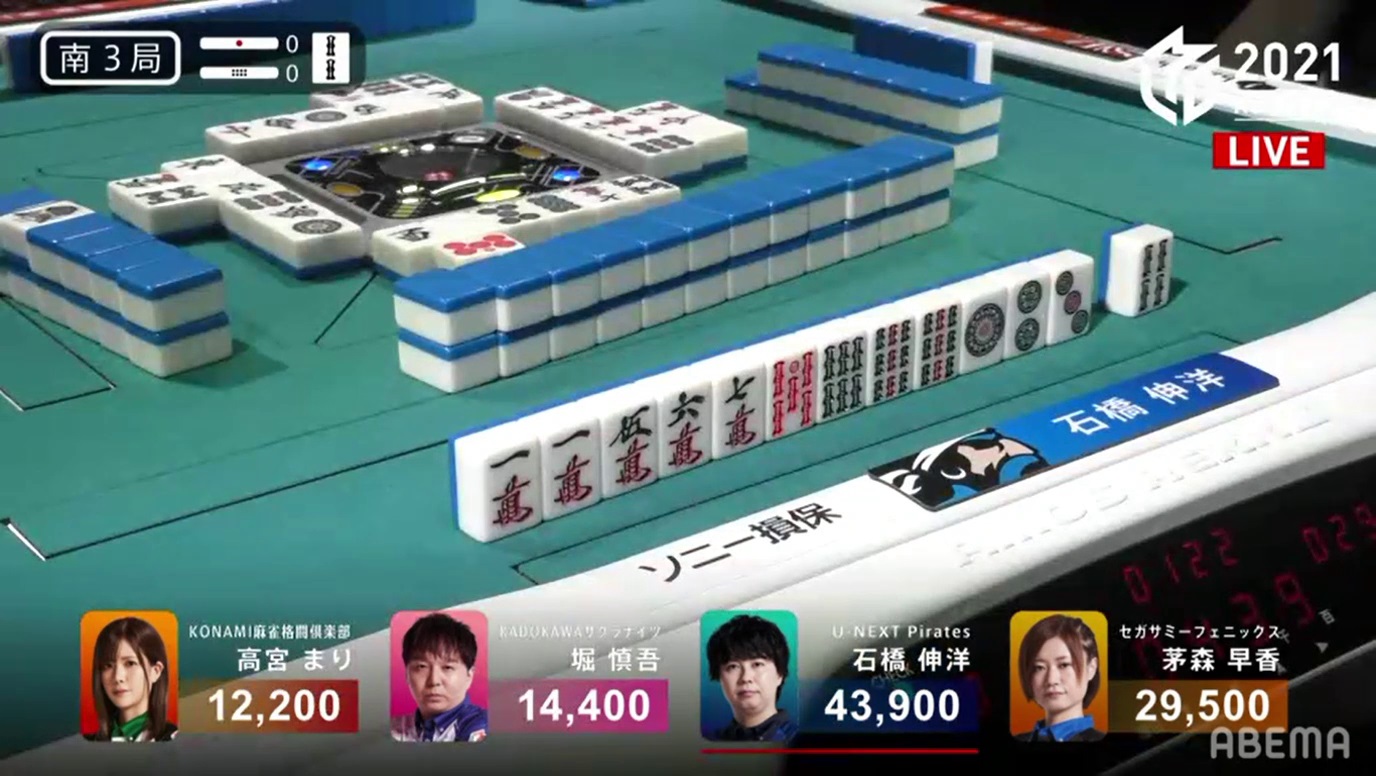 With the uradora indicator under the 3m being a 6p, it gives Kurosawa two more dora. Kurosawa wins the hand with Riichi/Iipeikou/Dora 1/Aka 1/Ura 2, just enough for a 12,000 point haneman. With a single kan from Sonoda, he turns the 5,200 hand into a 12,000 hand, loses his riichi stick and goes into the negatives in the process. As for Kurosawa, the win would move her above Sawazaki. Kurosawa would eventually go on and win the game, breaking Team Raiden’s 18-game winless streak.