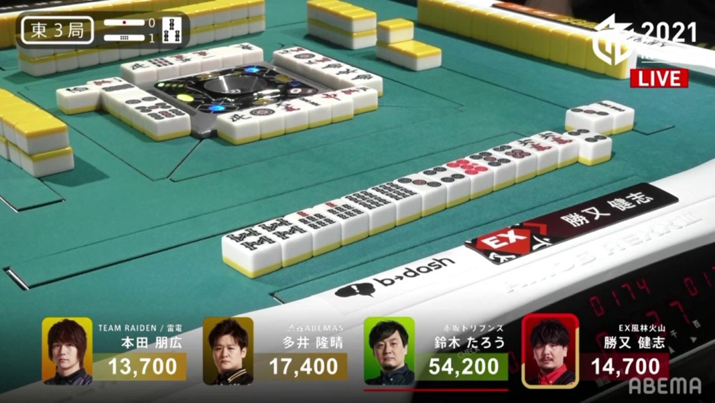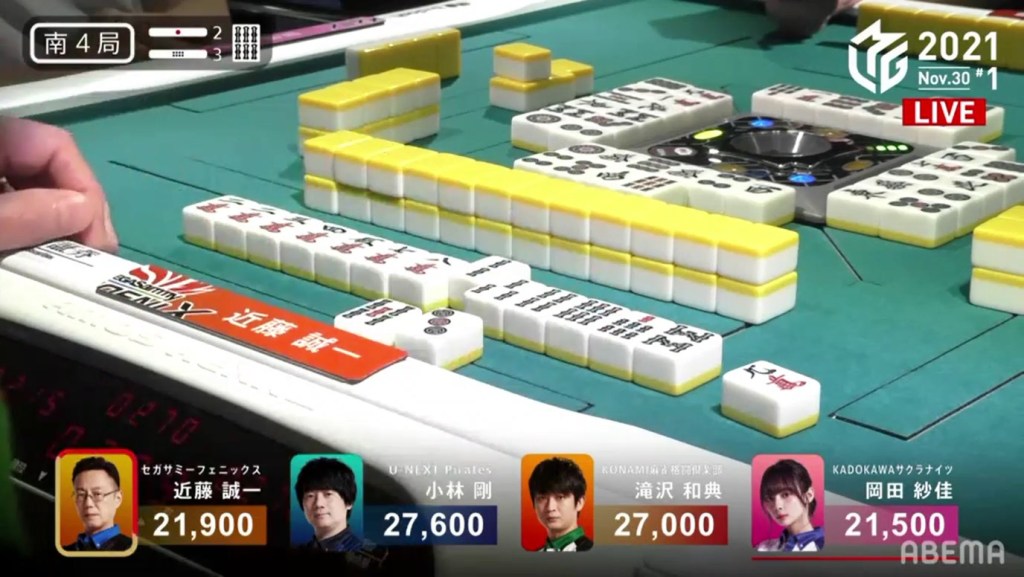 In S4-3, the score are close, with 6,100 separating 1st and 4th. 3rd place Kondo is 5,700 behind 1st place Kobayashi. Kondo starts out 3-shanten with a hand set for pinfu, while Kobayashi is 4-shanten with a pair of souths and a red 5p. The dealer Okada is also in the mix, who makes three early calls to get to tenpai on a 47m ryanmen wait. At this point, Kondo is 2-shanten and Kobayashi is iishanten with a pon of souths. Both of them choose to keep pushing, knowing that this hand is probably their best chance at keeping a good placement. In the 2nd row, Kondo draws to tenpai and calls riichi on a 69m ryanmen wait. With his pinfu and dora, the 3,900+2,900 would be enough to put him into 1st place. With Kondo’s just discarded 3m, Kobayashi has a chance to call it and get to tenpai. After taking over 40 seconds to decide, Kobayashi decides to call chii and discards the 9m to try for a 2s kanchan. With the 9m, Kobayashi ends up dealing into Kondo. Kondo wins the hand with Riichi/Pinfu/Dora 1 for 3,900+900 (plus two riichi sticks) to move him from 3rd to 1st and win the game.