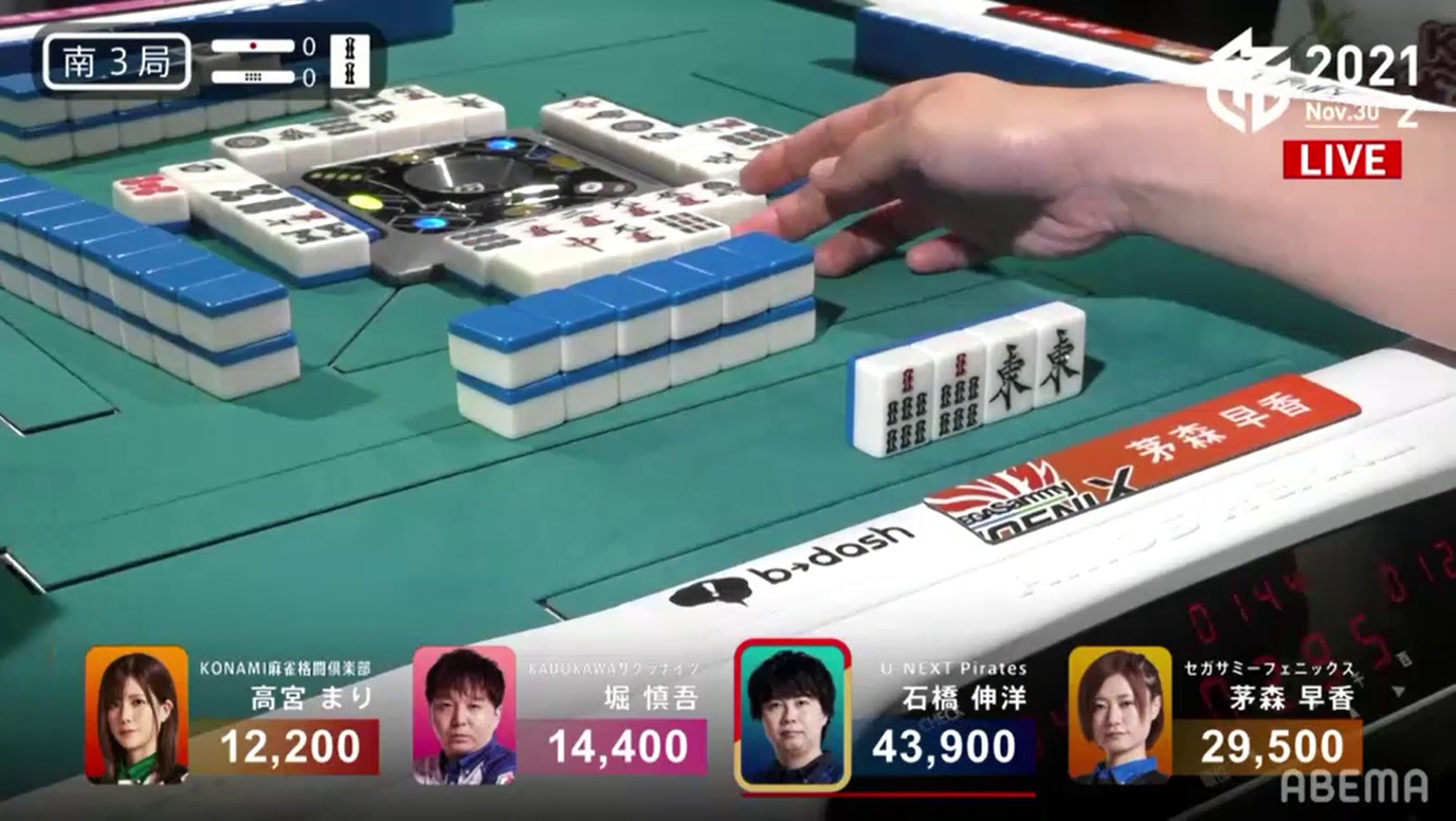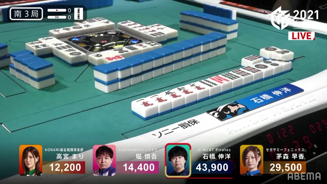 Skipping to S3-0, Ishibashi is still in 1st place, holding a 14,400 lead over 2nd place Kayamori. Ishibashi starts out 3-shanten for chiitoi with a red 5s for value. In the first row, Kayamori tries to rush her, calling pon on the south, chii on a 7p and chii on a 5s to get to tenpai on an east/7s shanpon wait. At this point, Ishibashi is iishanten and decides to keep pushing the hand. Soon after, Ishibashi gets to tenpai and calls riichi on a 1m/9s shanpon wait. Considering there are no visible dora 2s and the wait being poor, it’s a risky riichi from Ishibashi. However, Kayamori draws the 9s right after the riichi and deals into Ishibashi. Ishibashi wins the hand with Riichi/Ippatsu/Aka 1/Ura 1 for 12,000 and to take a clear lead.