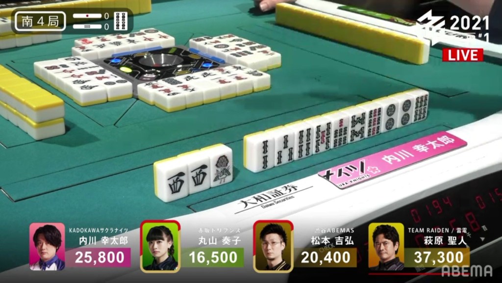 Seemingly out of nowhere, Uchikawa also manages to get to tenpai and stays dama on a west/2p shanpon. A tsumo by Uchikawa would be enough to get to 1st.