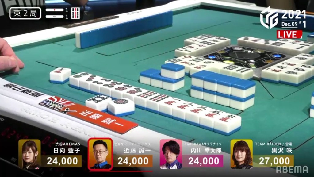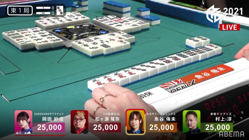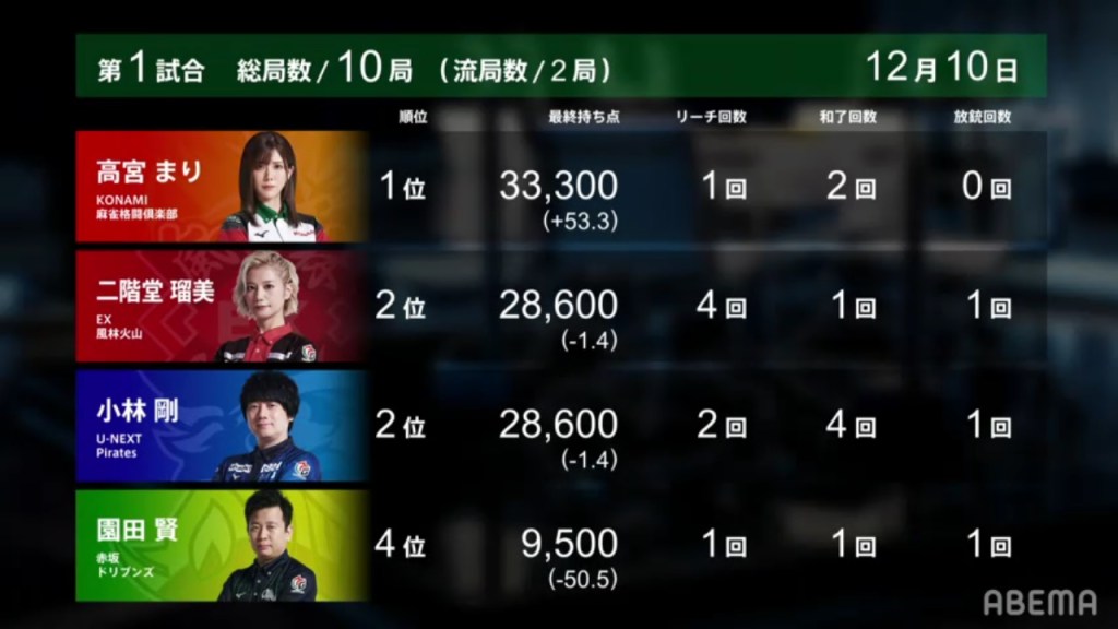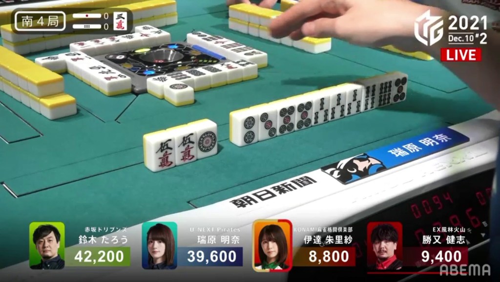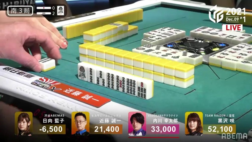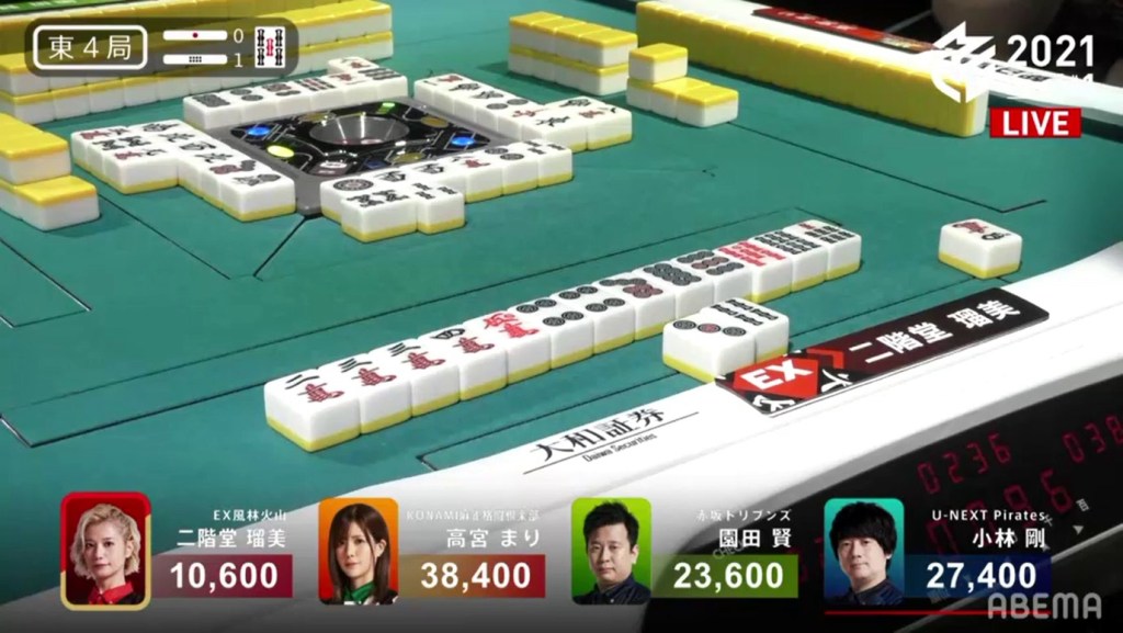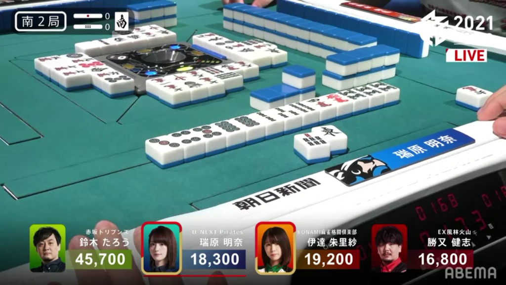 On Mizuhara’s very next draw, she gets the red 5s and wins the hand. Because of the red dora, Mizuhara gets a Tsumo/Aka 1 win for 700/1,300 (plus Date’s riichi stick) to get an unexpected 1st.