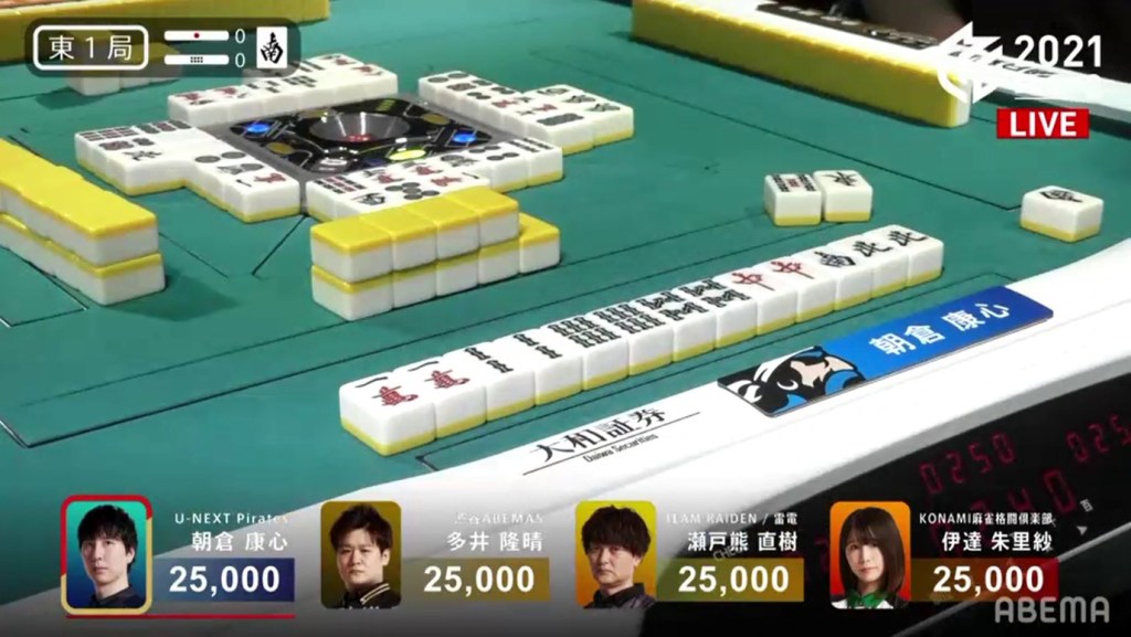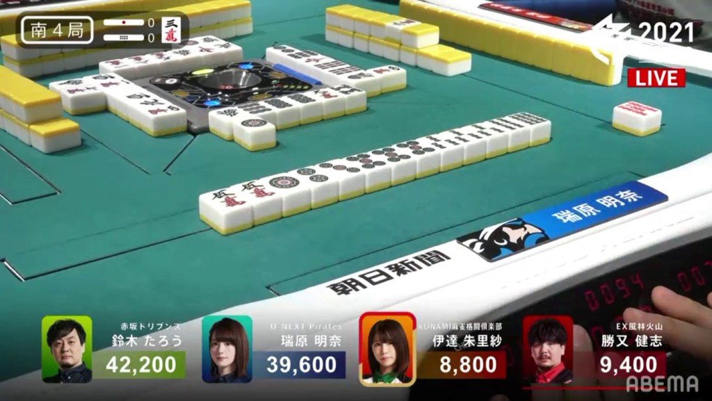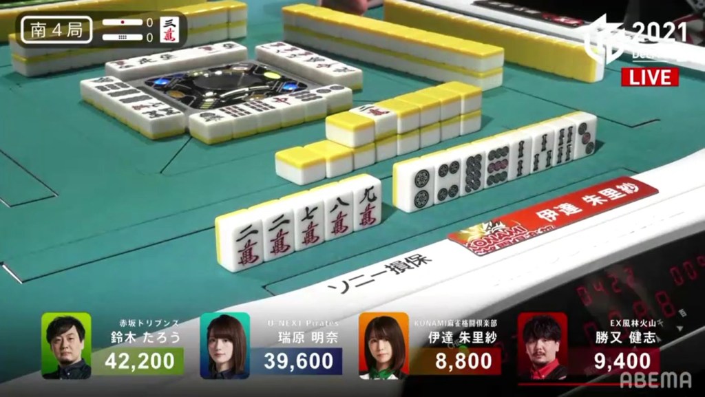 In S4-0, 4th place Date is 600 behind 3rd place Katsumata and 2nd place Mizuhara is 2,600 behind 1st place Taro. Mizuhara starts out with a 2-shanten hand without the value she needs, while Date is 3-shanten with a hand looking like it will be riichi only. At the end of the 1st row, Date gets to tenpai and calls riichi on a 7p penchan wait.