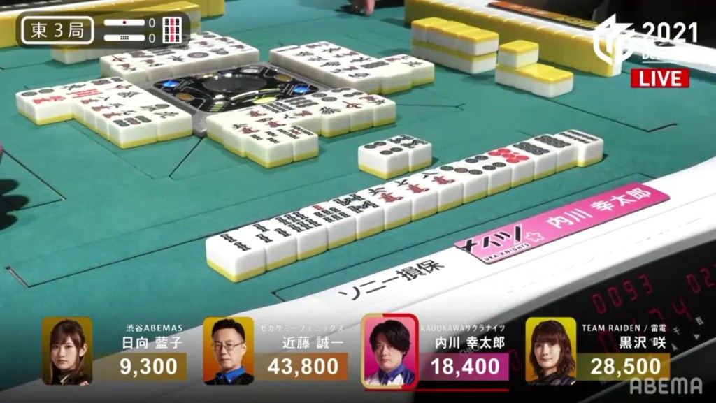 In E2-0, Uotani starts out with a 5-shanten hand (4-shanten for chiitoi) with an ankou of 7m dora. With bad hand shapes and Okada making two early calls, Uotani’s chances seemed slim. However, Uotani managed to get to iishanten near the start of the 2nd row. In the middle of the row, Uotani gets to tenpai and stays dama on a 4m kanchan wait. Soon after, Murakami gets to tenpai and calls riichi on a 7m dora kanchan wait. Looking around the table, there are no 7m left in the wall and one 4m left in the wall, meaning that the hand is likely going to a draw. However, Murakami manages to draw the last 4m and deals into Uotani. Uotani wins the hand with Tanyao/Dora 3 for 8,000. Adding on Murakami’s riichi stick, she adds 9,000 points to her score. With the 16,000 from the previous hand, her score becomes exactly 50,000 in two hands.