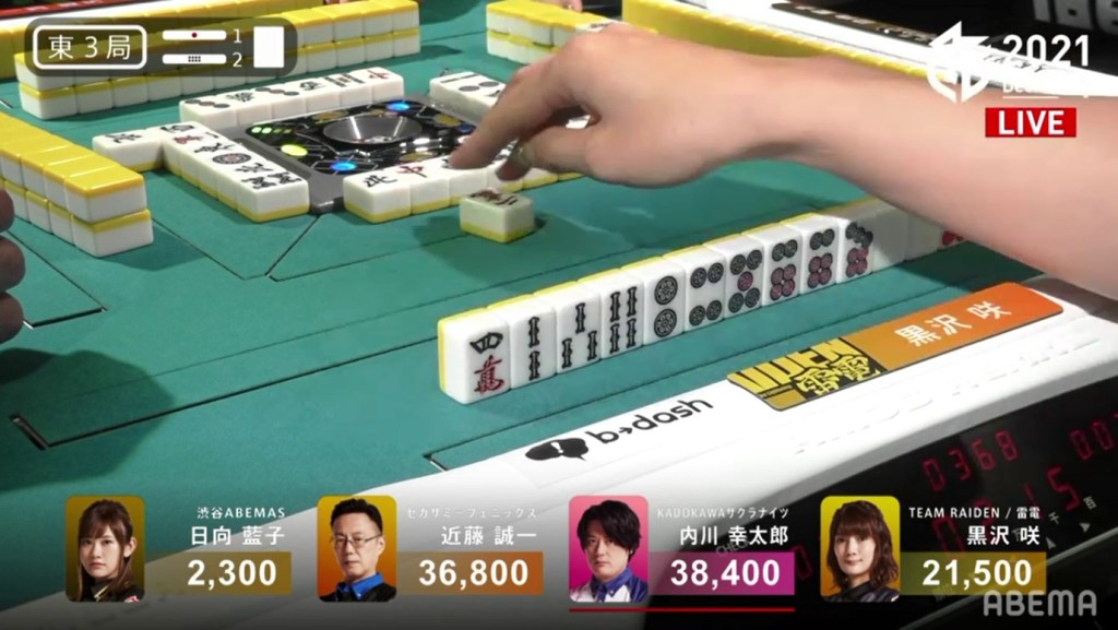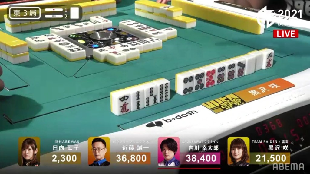 In E3-2, Kurosawa is in 3rd place and starts out with a 4-shanten hand with an isolated white dragon dora. Pairing it up on turn 4 and getting to iishanten by the end of the 1st row, she has a chance to take a tenpai at the start of the second row. After taking a bit of time to decide whether to take the 3m kanchan yakuless tenpai, she chooses not to and starts to break up the 24m group for a better wait. On the very next turn, she draws the 3m.