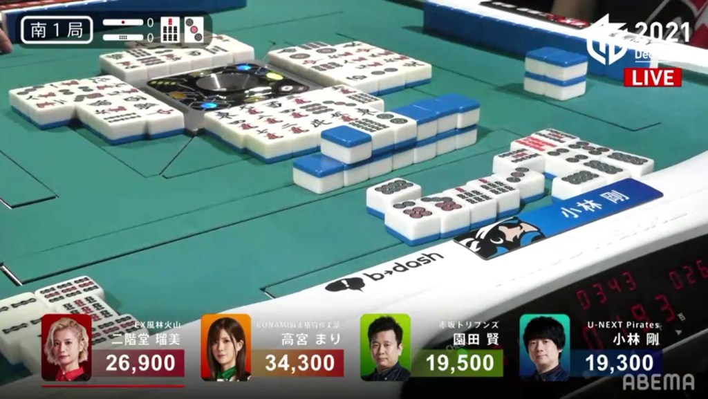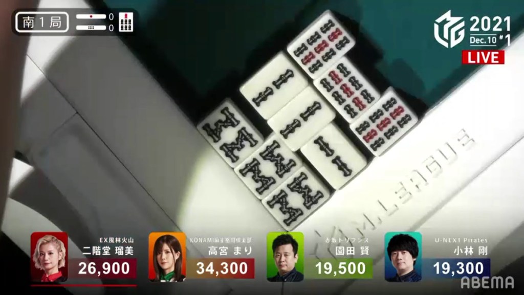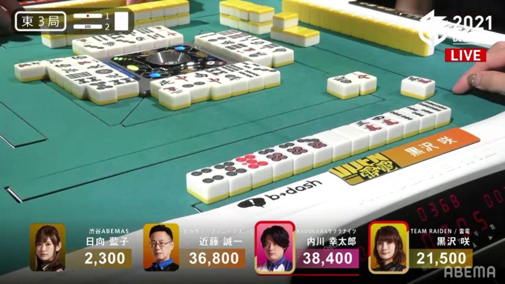Though a one person tenpai draw would be a 4,000 point swing, the riichi stick reduced it to 3,000. With the 3,000 point difference overcome, Rumi and Kobayashi were tied at 2nd place.