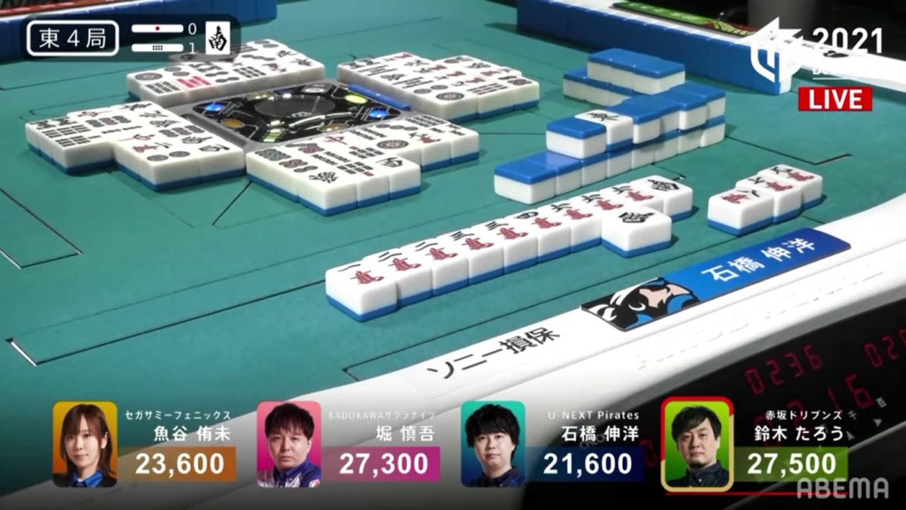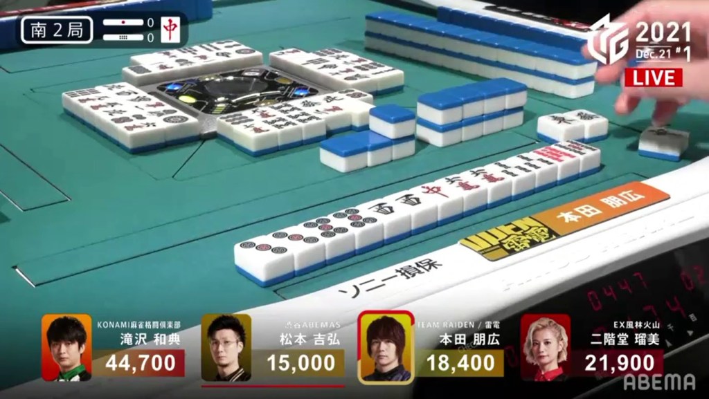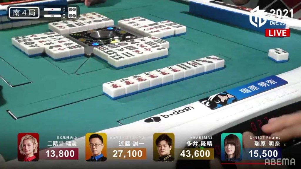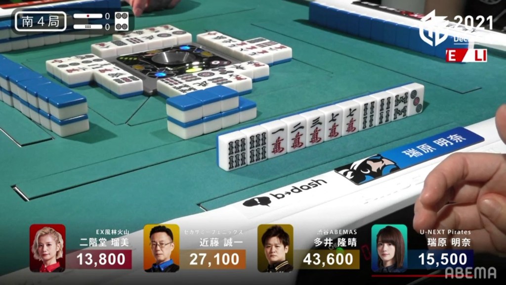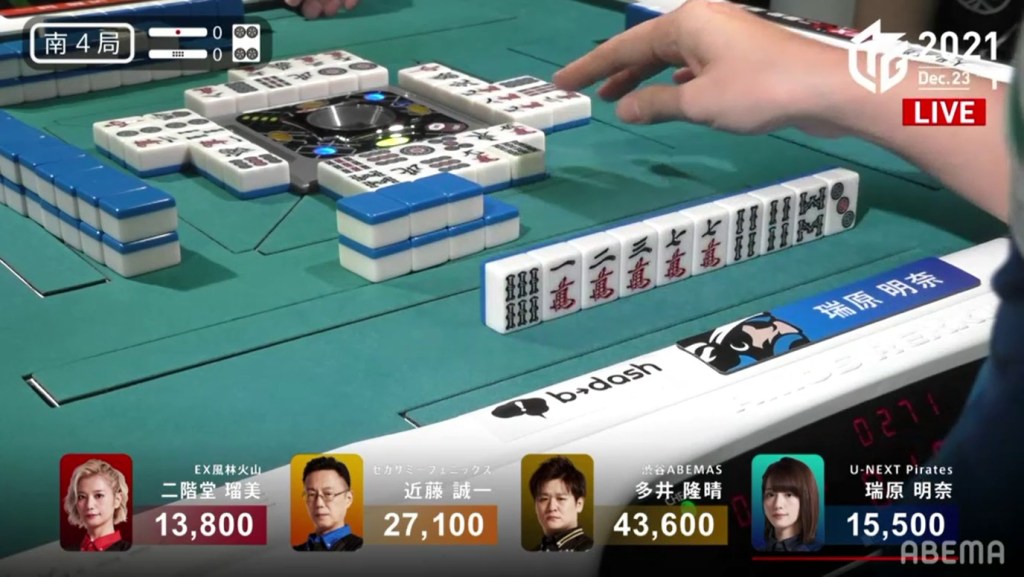 The turn after, she draws another 3p, seemingly ruining her hand. She throws an 8s to stall the decision, but takes the very bold decision to throw the 4p dora a few turns later to take a 36s ryanmen tenpai. On Mizuhara’s 2nd last draw, she finds the 3s to win the hand. Mizuhara wins with South only for 500 all, managing to find points in a very difficult situation.