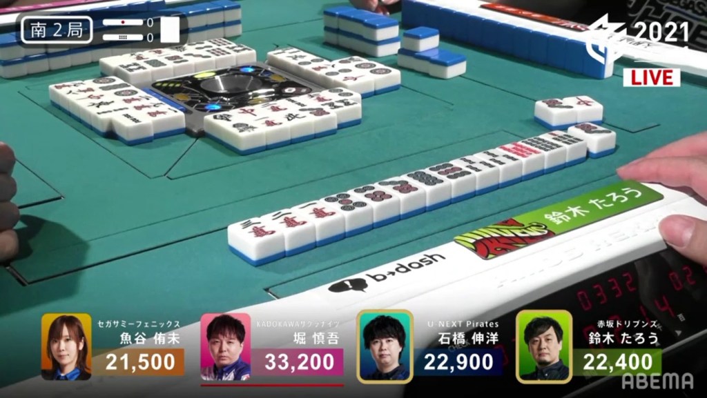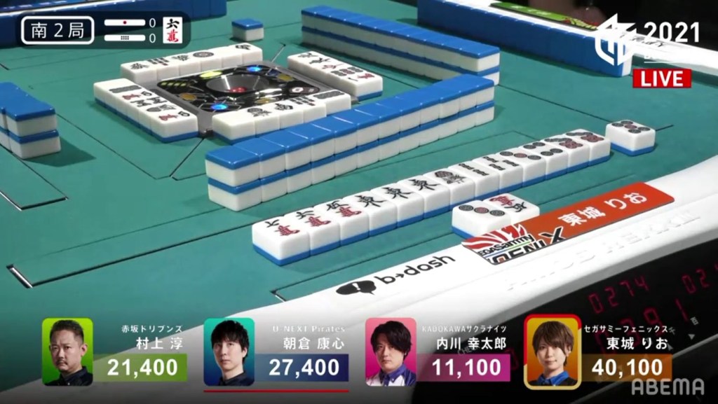 In S1-4, Asakura is in 4th place with 2,200 points on the table. He starts out with a very good 2-shanten hand with a pair of white dragon dora. He draws a red 5s dora on turn 2 and gets to iishanten on turn 3. On turn 10, Asakura gets to tenpai and calls riichi on a 2p/white dragon shanpon wait. On the ippatsu turn, Asakura draws the yasume 2p. Even though it’s the yasume, Asakura still wins a significant Riichi/Ippatsu/Tsumo/Dora 2/Aka 1 for 3,000+400/6,000+400 (plus a riichi stick) to move into 2nd place.