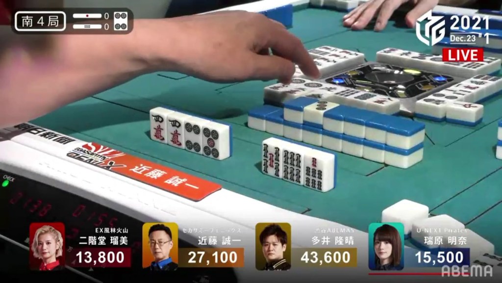 With the danger of the 3p against Kondo’s two calls, Mizuhara decides to hold onto it and throw the 6s instead. Mizuhara draws a 4p the next turn to secure the 3p in her hand while still moving forward.