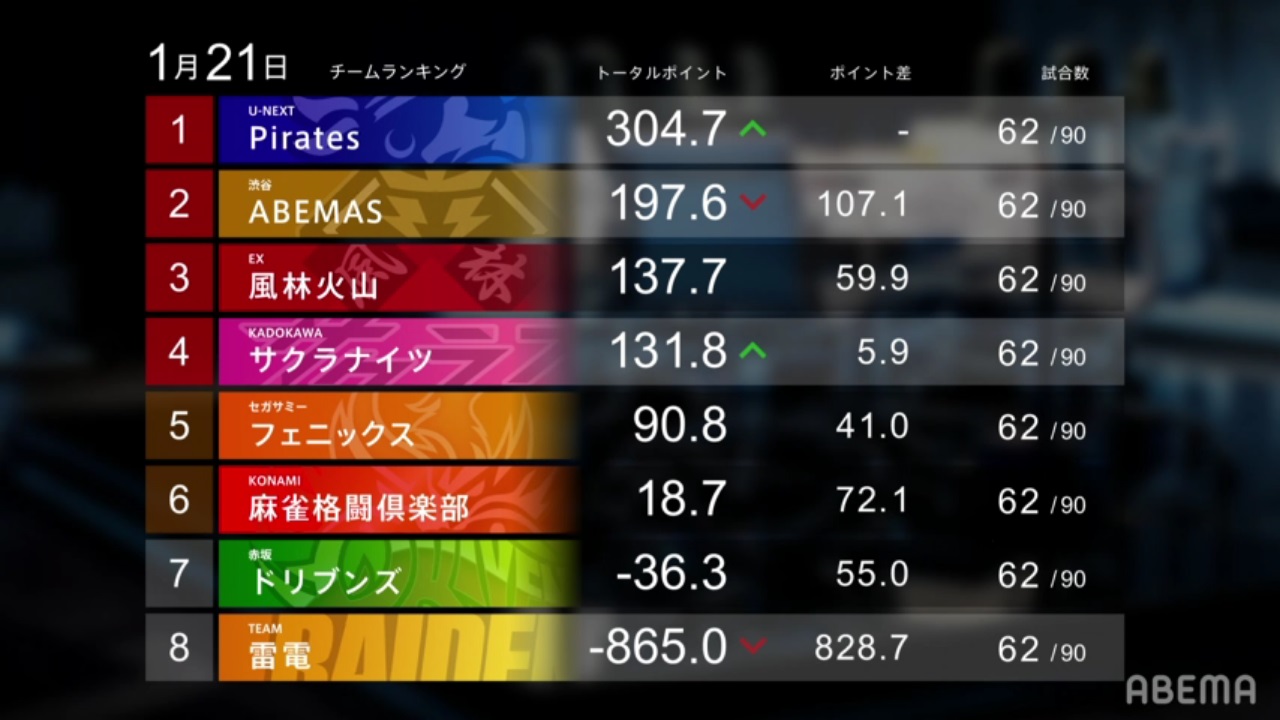 Going into the negatives, the U-Next Pirates are 5th in this week’s performance rankings. It was KobaGo week this week and he was meet with some big struggles. Getting 4th in the first game and just barely escaping 4th by 400 points in the second game, the team fell out of 1st place for a bit. However, with a 1st from Mizuhara in the third game and Mizuhara’s support to help Kobayashi get to 2nd in the fourth game, the team got themselves back to around where they started. With only a -7.8 loss and a 1/1/1/1 record, the ends the week in 1st place.