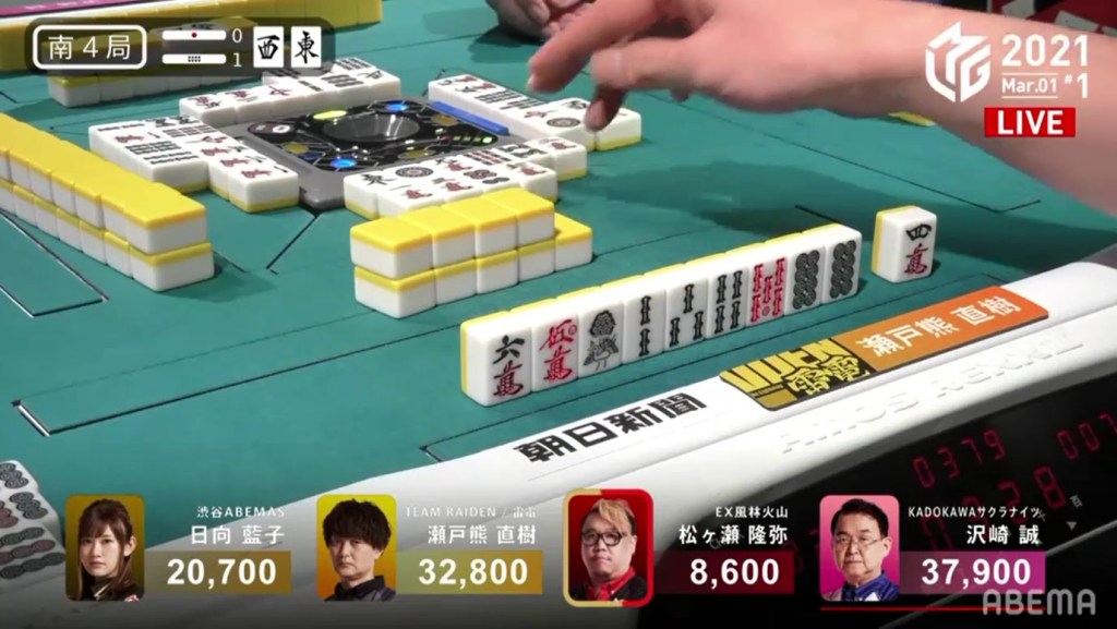 In S4-1, Setokuma is trailing dealer Sawazaki by 5,100 and starts out 4-shanten, but has value with a red 5m and a single west as the west seat. Early on, Setokuma’s chances of becoming 1st was put in jeopardy when Hinata called pon on the south to get to an iishanten and got to a 3p/9p shanpon tenpai soon after. However, Hinata dropped her tenpai to hold a west dora, allowing her to both have a chance to take 2nd and to prevent 4th place Matsugase from getting points.