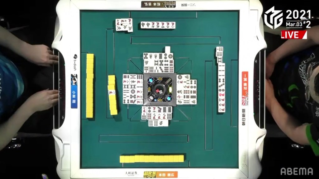 Kondo draws to tenpai and discards the 4p. Matsumoto draws and discards the white dragon to keep his tenpai. Kobayashi continues his folding and discards the 4p. Honda (whose nickname is the “Yakuman Prince”) draws the very last tile in the wall and gets…