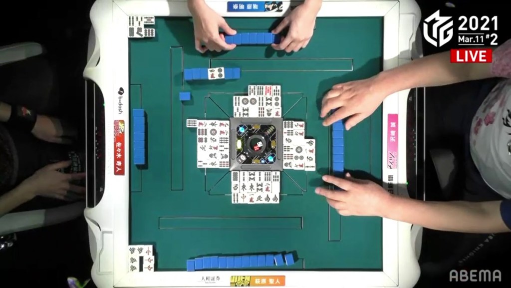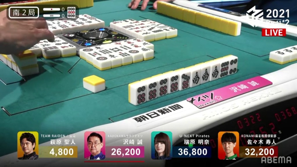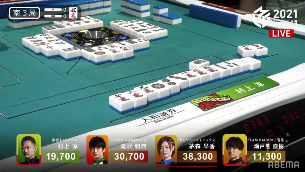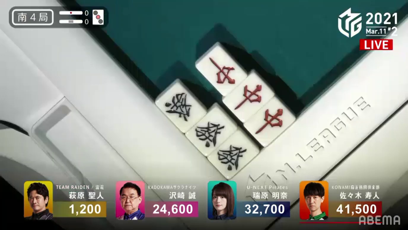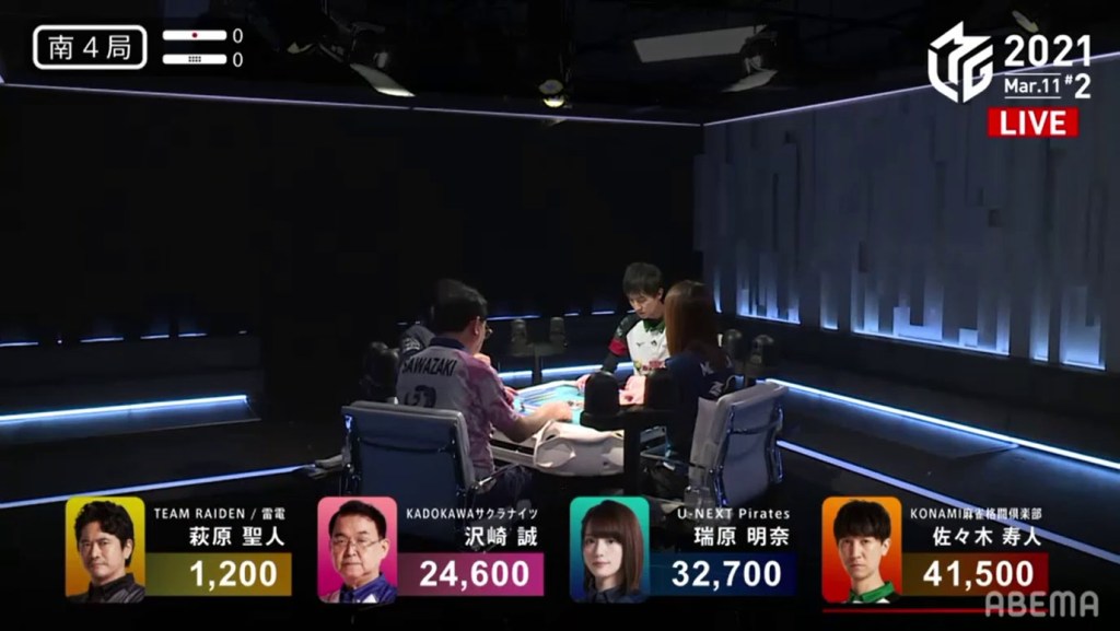 The 180th game of M-League 2021 featured the MVP battle. With 12.8pts separating 1st place Mizuhara and 2nd place Sawazaki, whichever one ranks higher in this game wins the MVP award. Also in this game is Sasaki Hisato, last season’s MVP, and Hagiwara Masato. In short, Mizuhara vs. Makoto vs. Maou vs. Masato.