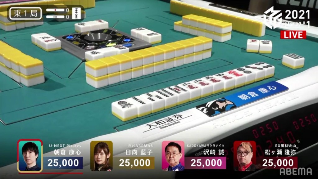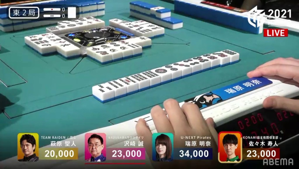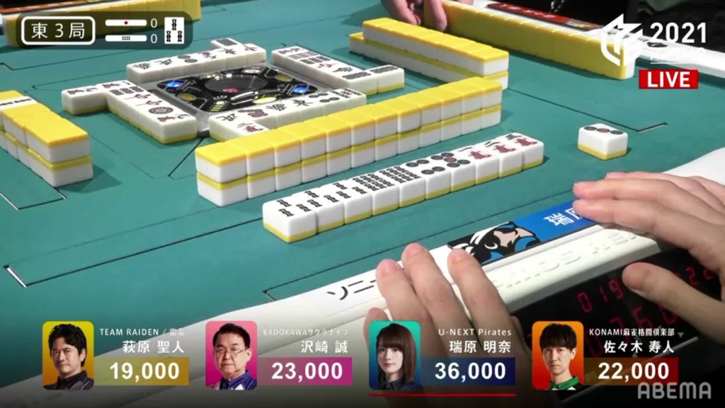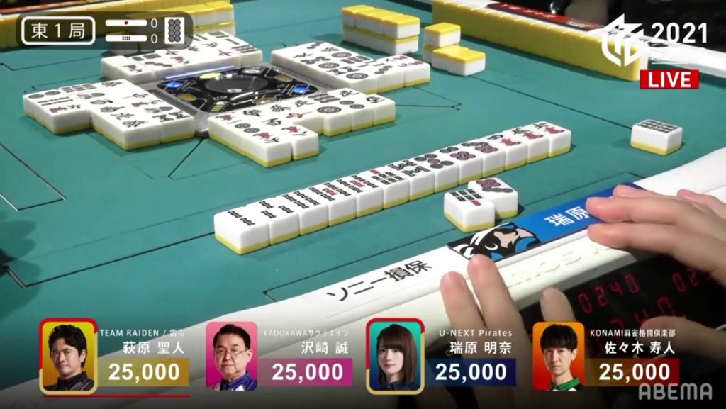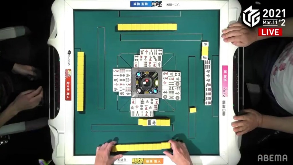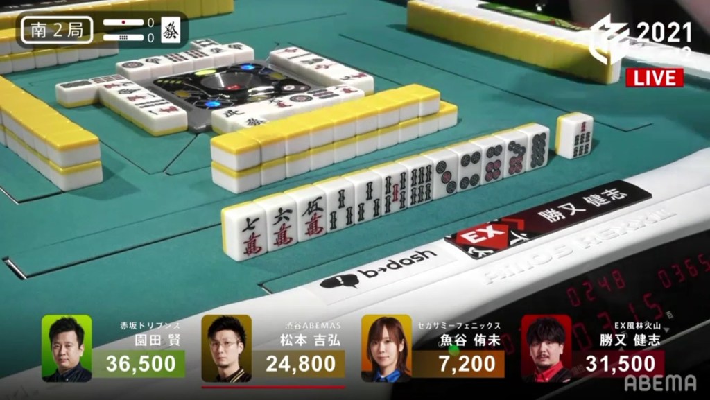 The 180th game of M-League 2021 featured the MVP battle. With 12.8pts separating 1st place Mizuhara and 2nd place Sawazaki, whichever one ranks higher in this game wins the MVP award. Also in this game is Sasaki Hisato, last season’s MVP, and Hagiwara Masato. In short, Mizuhara vs. Makoto vs. Maou vs. Masato.