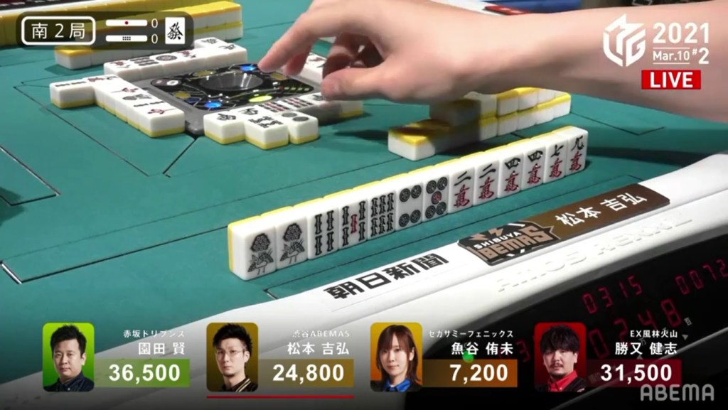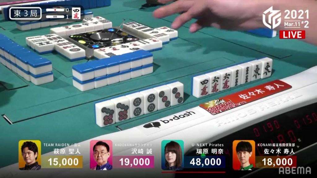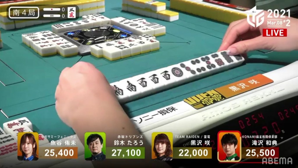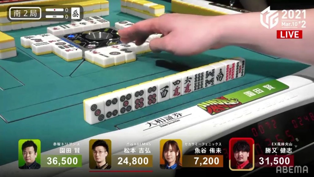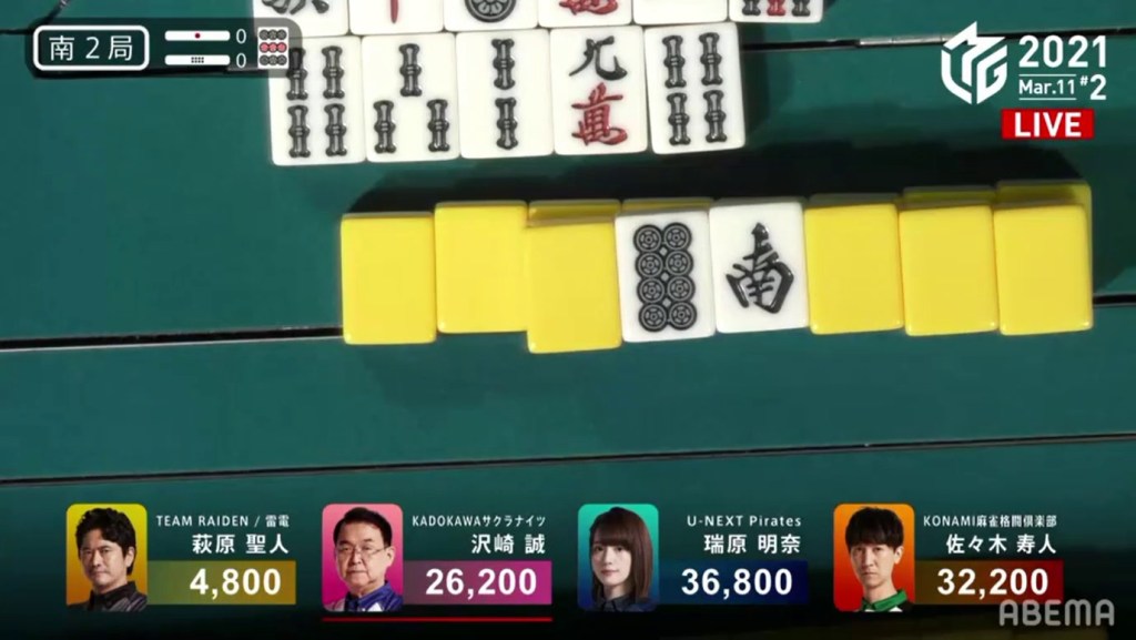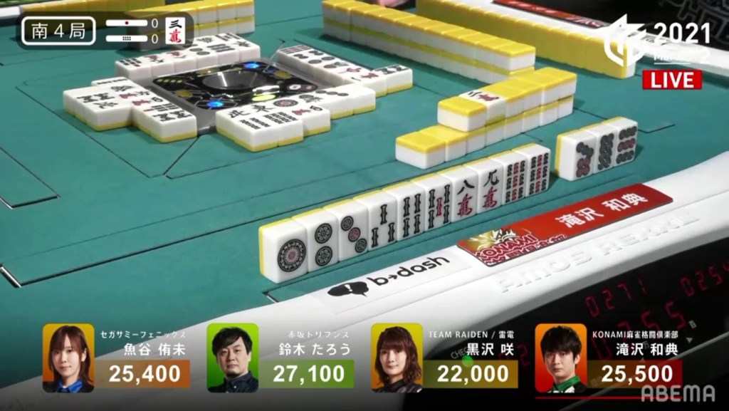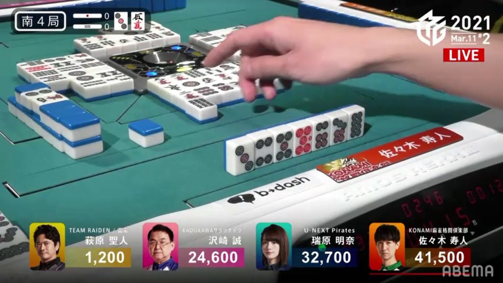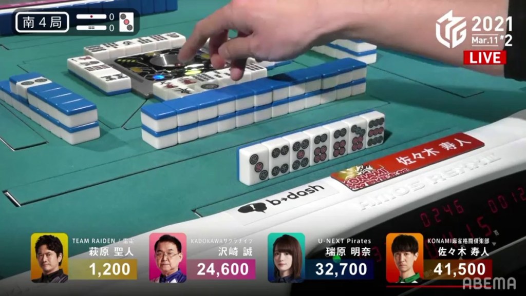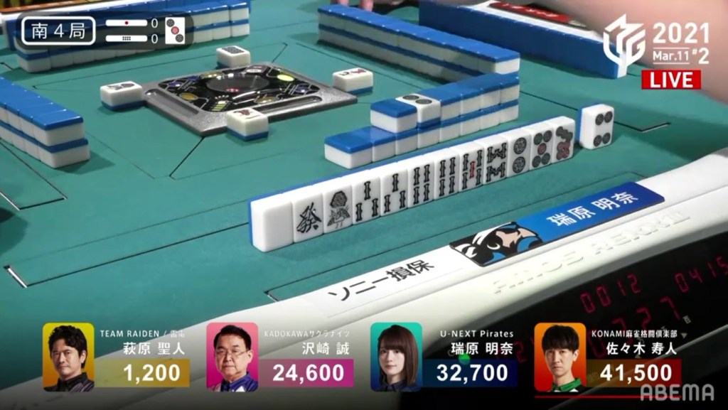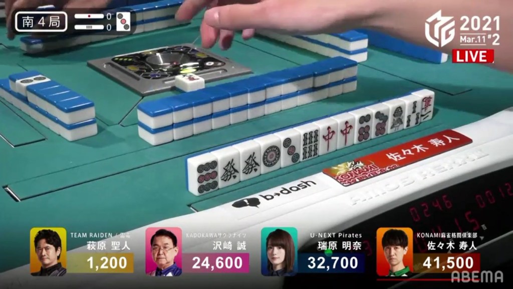 With a confused look on Sonoda’s face, Katsumata wins the hand with Riichi/Pinfu/Tanyao for 3,900 and the lead.
