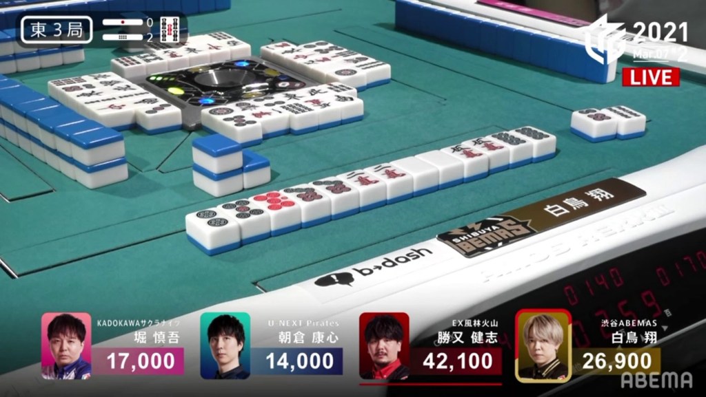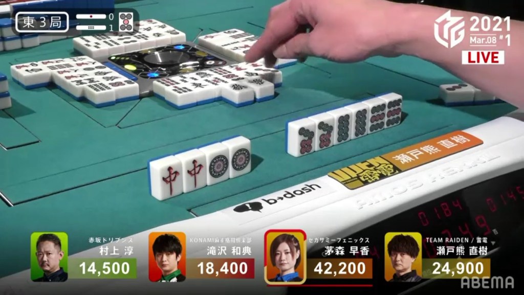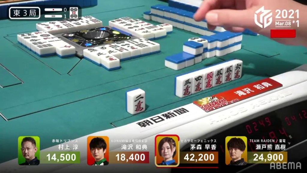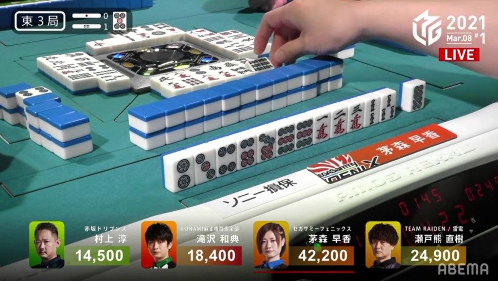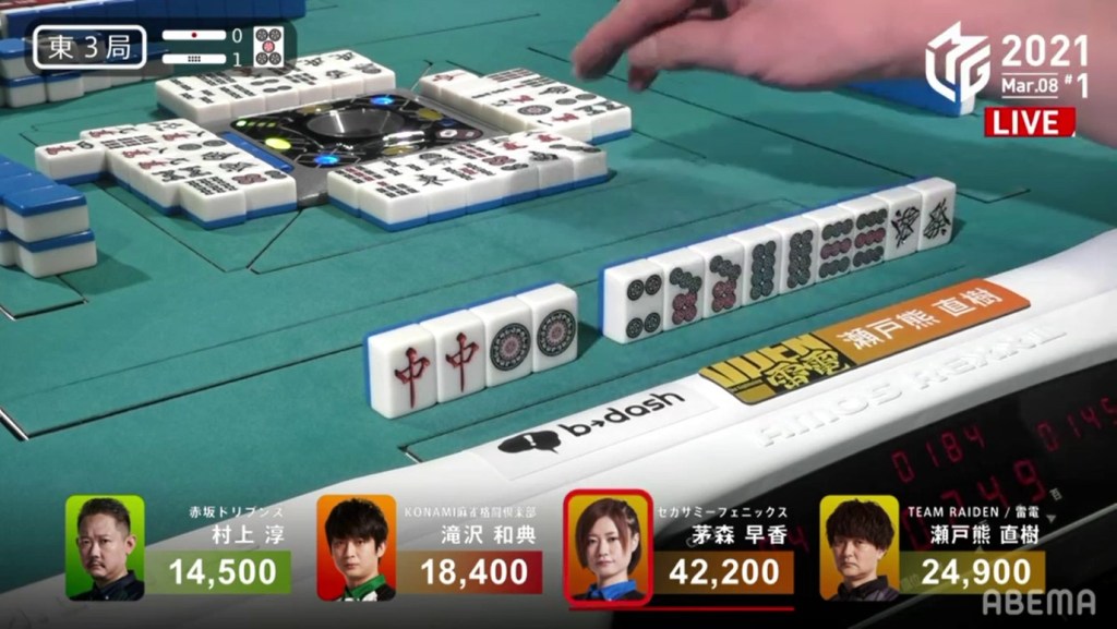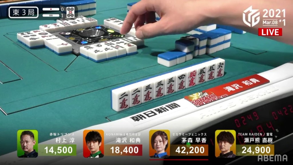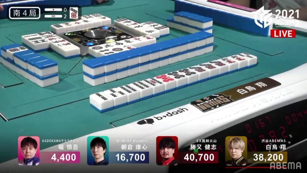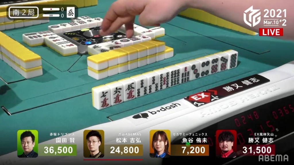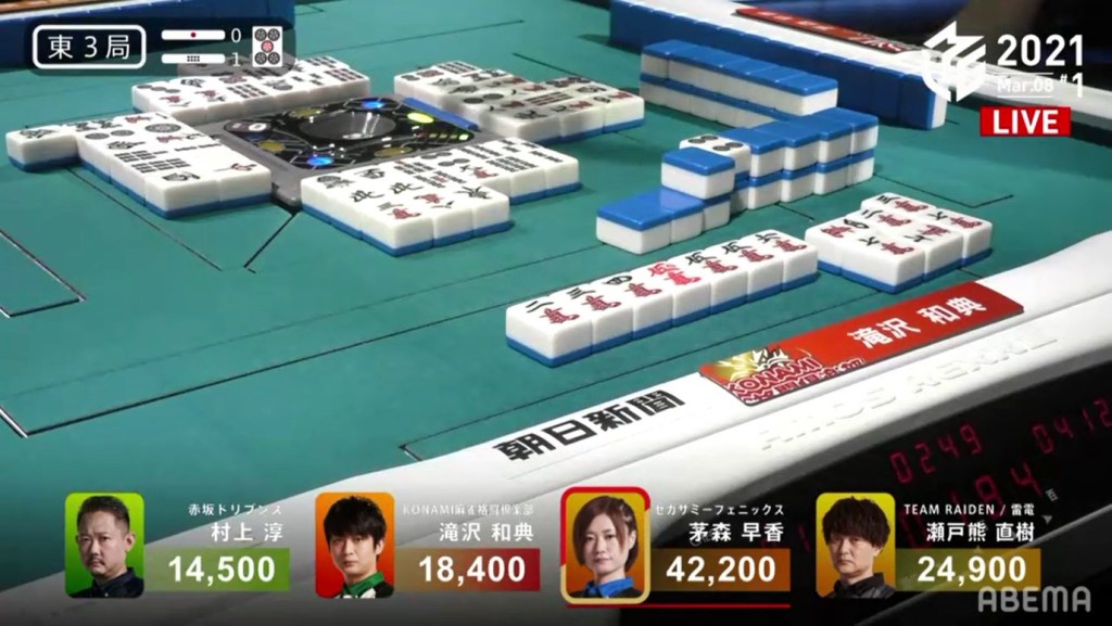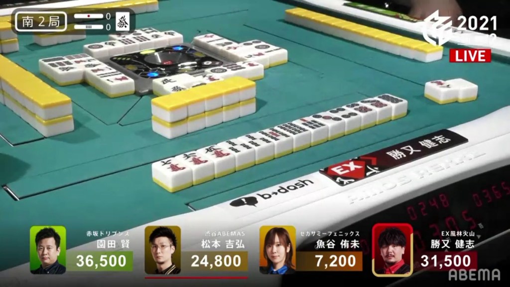 With a confused look on Sonoda’s face, Katsumata wins the hand with Riichi/Pinfu/Tanyao for 3,900 and the lead.