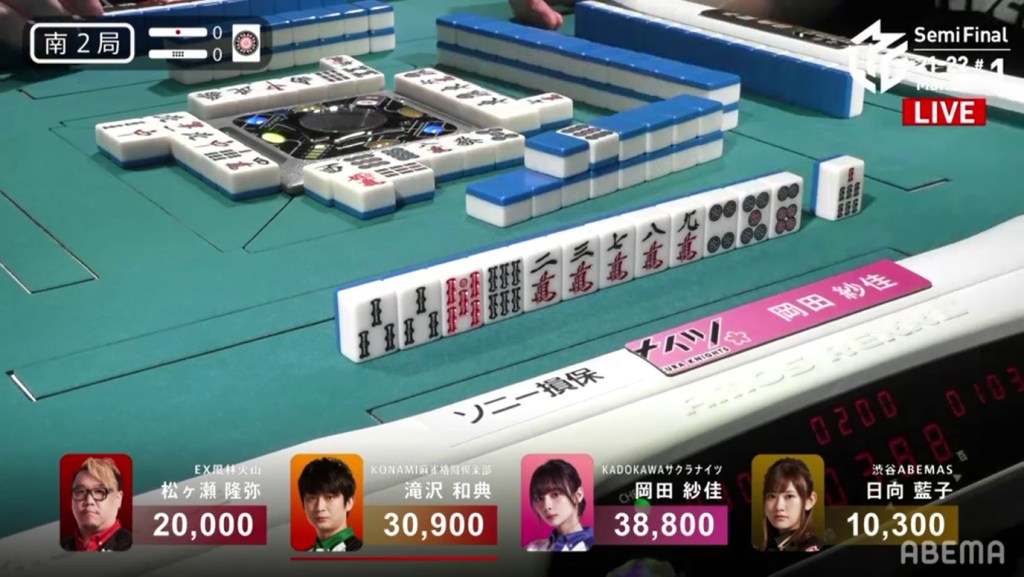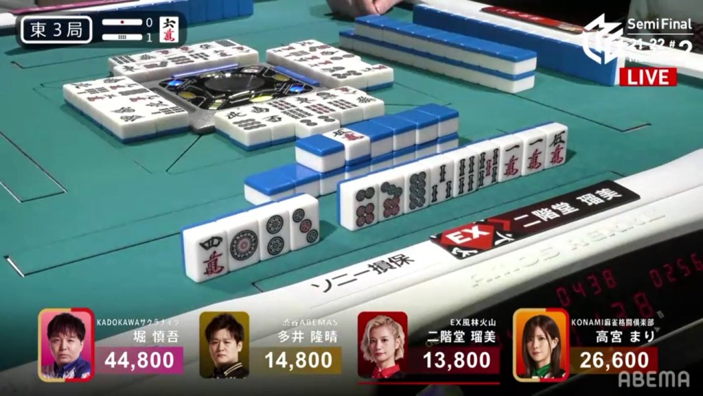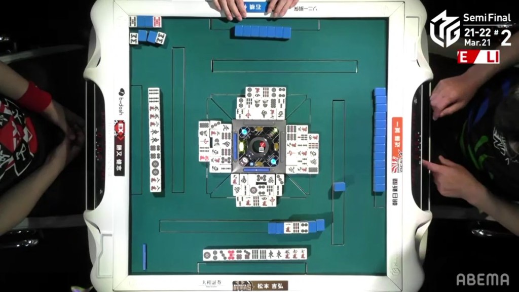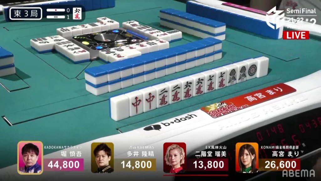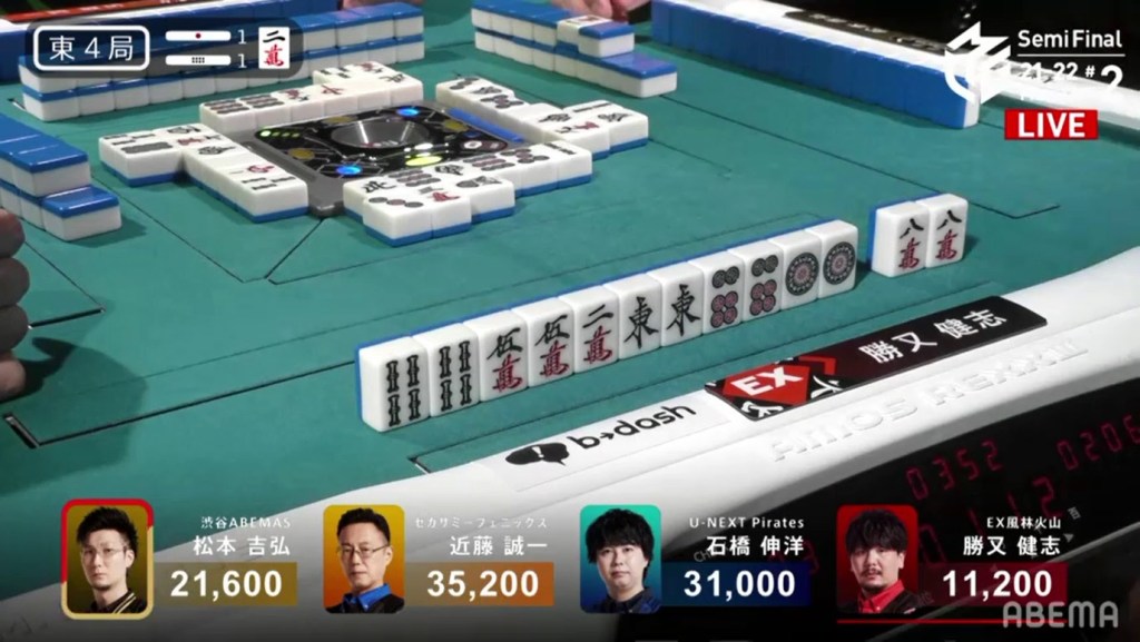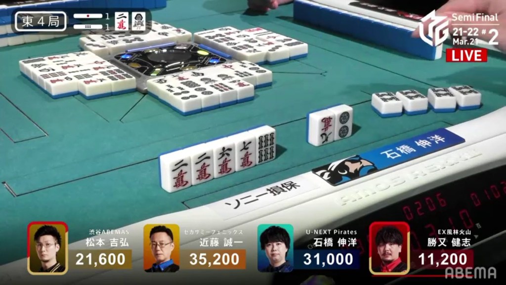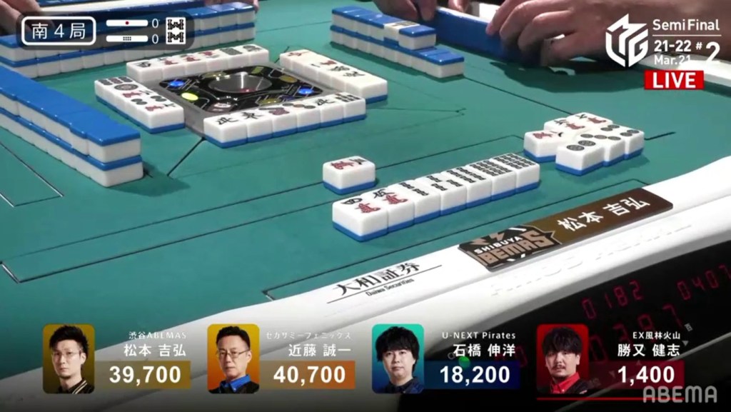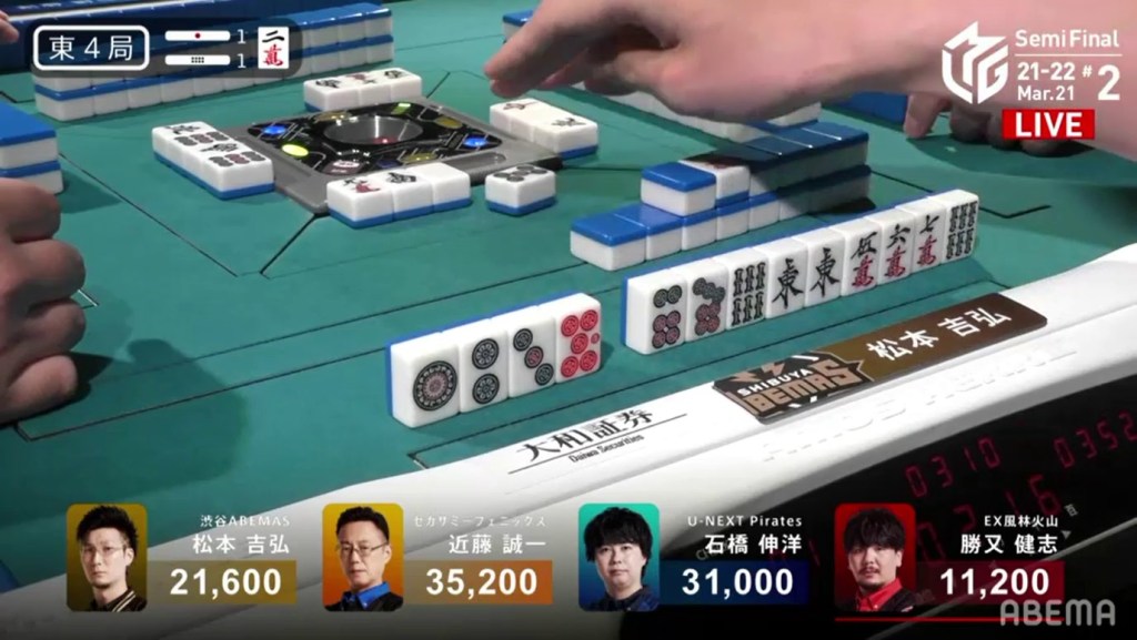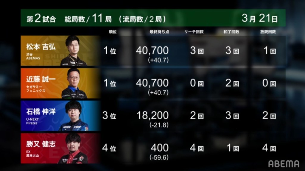 With the hand, Matsumoto brings his score to 40,700, the same score as Kondo and tying them at 1st place. This isn’t the first time this season that two players have tied for 1st. On October 28, 2021, Honda and Hori both ended with 38,000 and tied for 1st place.