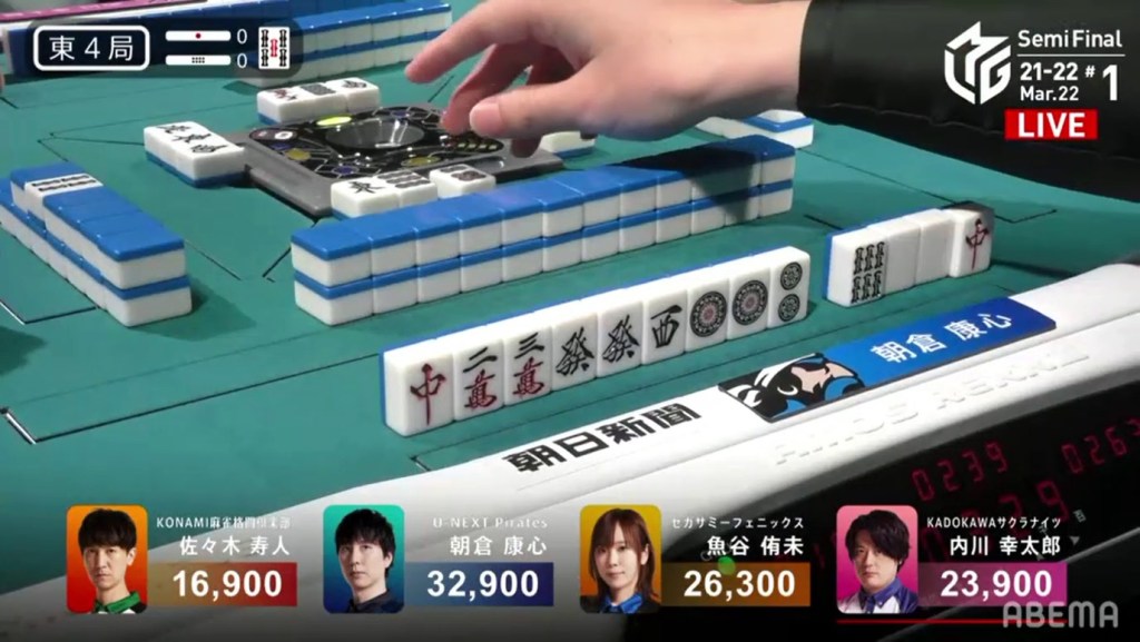 In E4-0, Asakura is in 1st place and trying to keep it that way. He starts out with pairs of the green and white dragon, as well as a singleton of the red dragon. On turn 3, Asakura pairs up the red dragon, giving him three pairs of dragons. Fans had flashbacks of the haipai Asakura had in the 2019 finals that gave him a daisangen and helped the team win the championship that year.