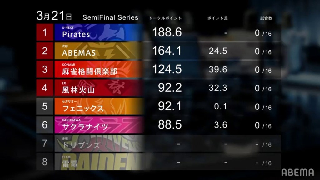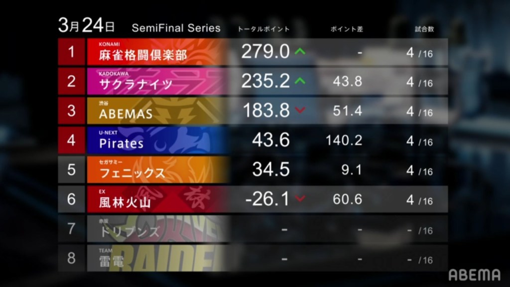 The U-Next Pirates. The scores were close going into the semifinals and the Pirates were in 1st, so they had the most to lose. Because of this, they lost the most. From a bold push from Mizuhara to some bad luck from Asakura, the team tried their best but couldn’t get there. They were first at the start of their games, but ended up losing points through rons and tsumos. Having a 0/0/2/2 record and a 145.0pts loss, the team fell hard, going from 1st to 4th.