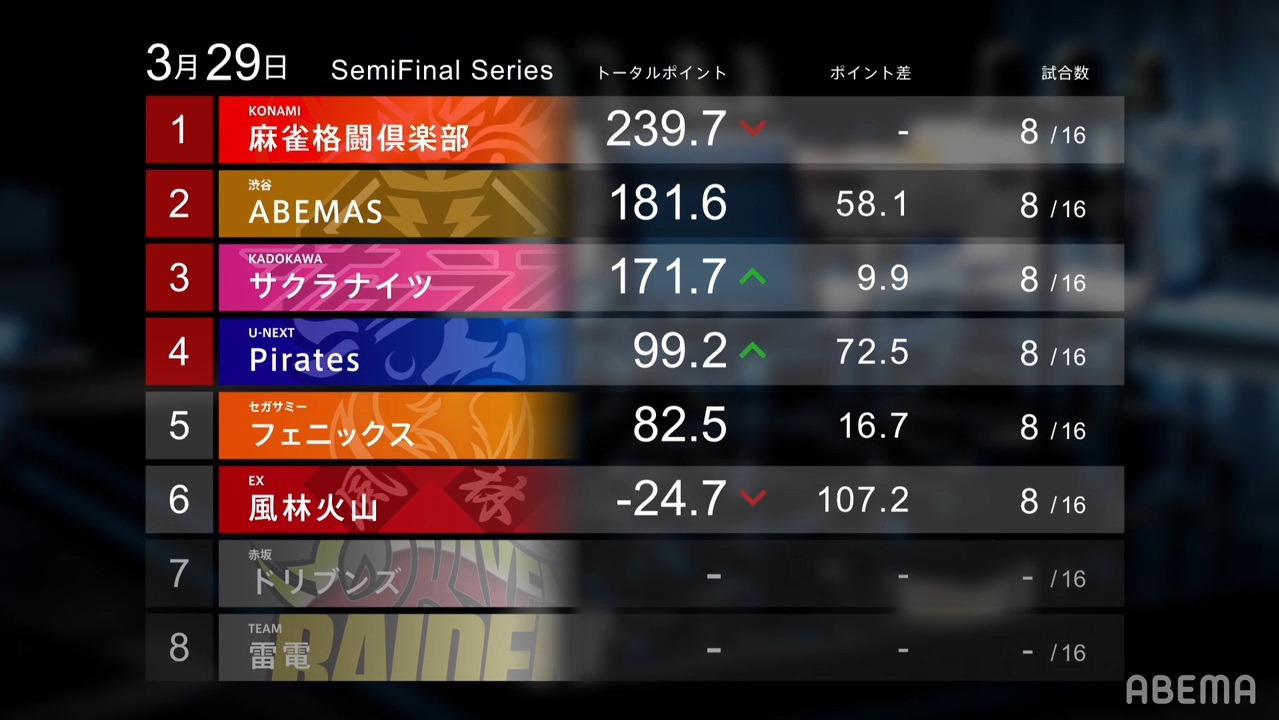 The next-best performers are Sega Sammy Phoenix. The team viewed a 4th place as a disaster, so they avoided it. It started with some big hands from Uotani to take 1st, followed by a second from Kayamori. And though they got a double 3rd in their next set of games, they had a score of above 20,000 in both of them. Despite the decent 1/1/2/0 record and +48.0 gain, the team still sits in 5th place. However, they have shown that they have what they need to climb up in the rankings in the second half of the semifinals.