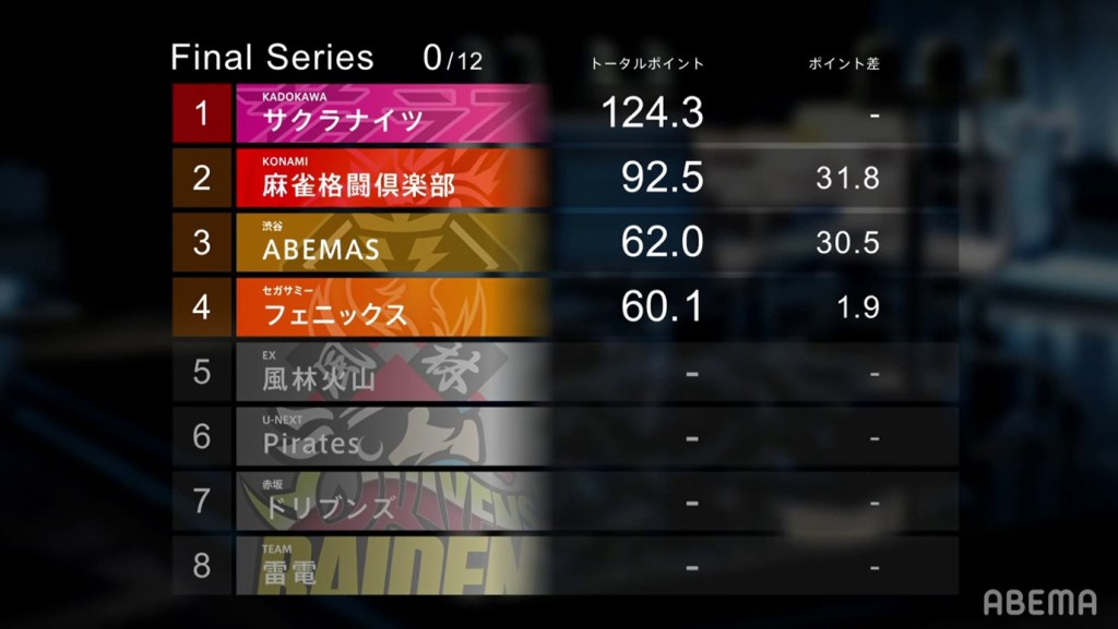The Kadokawa Sakura Knights are in the lead, followed by the Konami Mahjong Fight Club, the Shibuya Abemas and the Sega Sammy Phoenix. The difference between 1st and 4th is just 64.2pts, meaning that even the 1st game can have a dramatic impact on the standings.