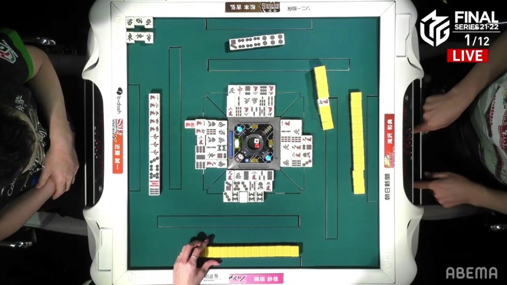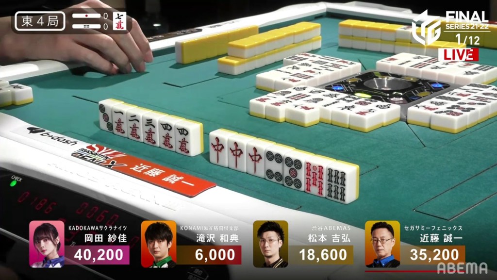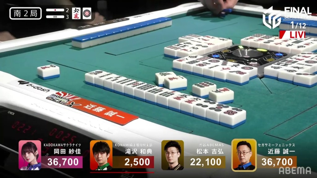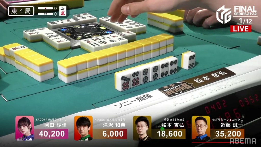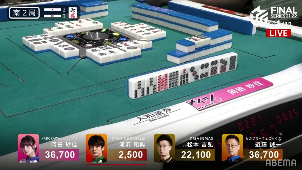 Kondo, who had been working hard to clean his hand up, was 2-shanten by this point and kept pushing. On Kondo’s right, Okada gets to tenpai and waits dama on a 4s kanchan.