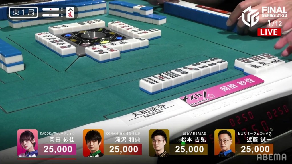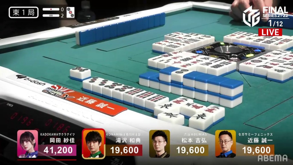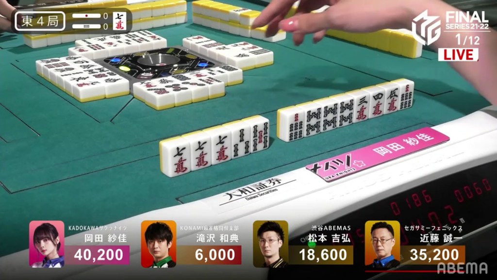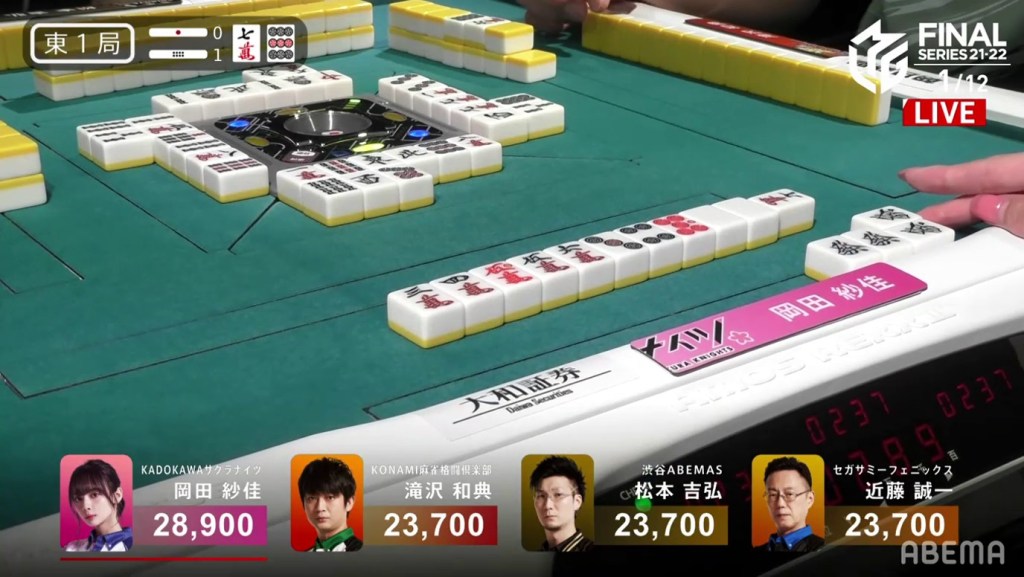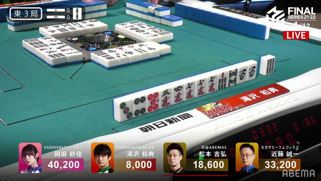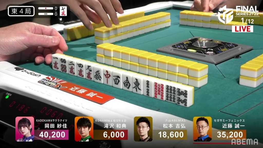 Kondo, who had been working hard to clean his hand up, was 2-shanten by this point and kept pushing. On Kondo’s right, Okada gets to tenpai and waits dama on a 4s kanchan.