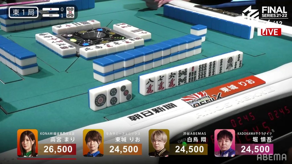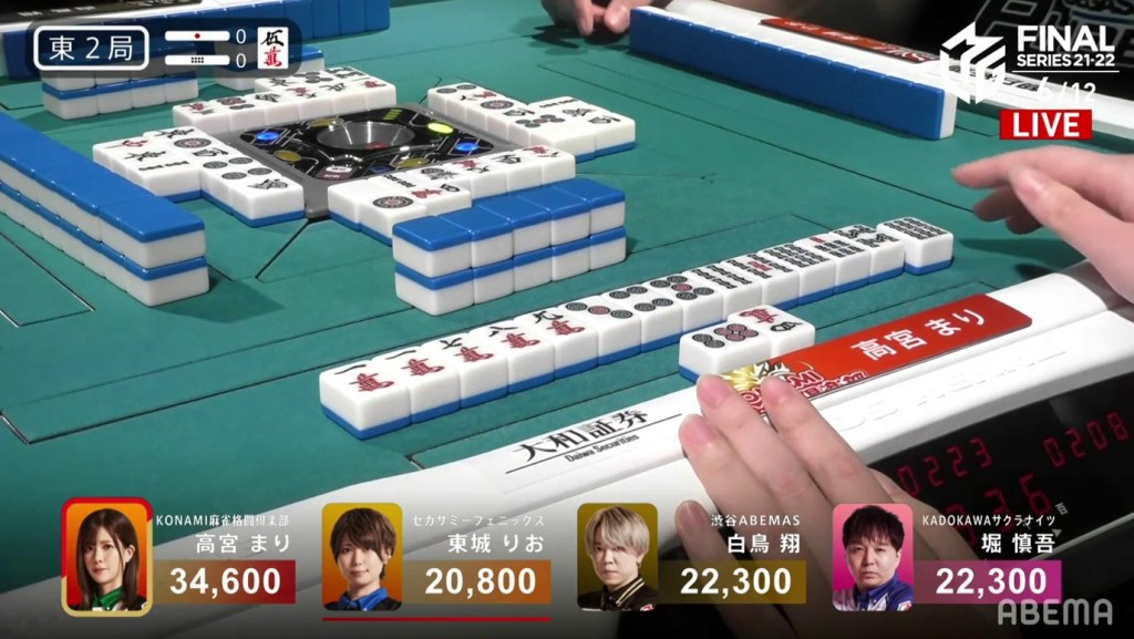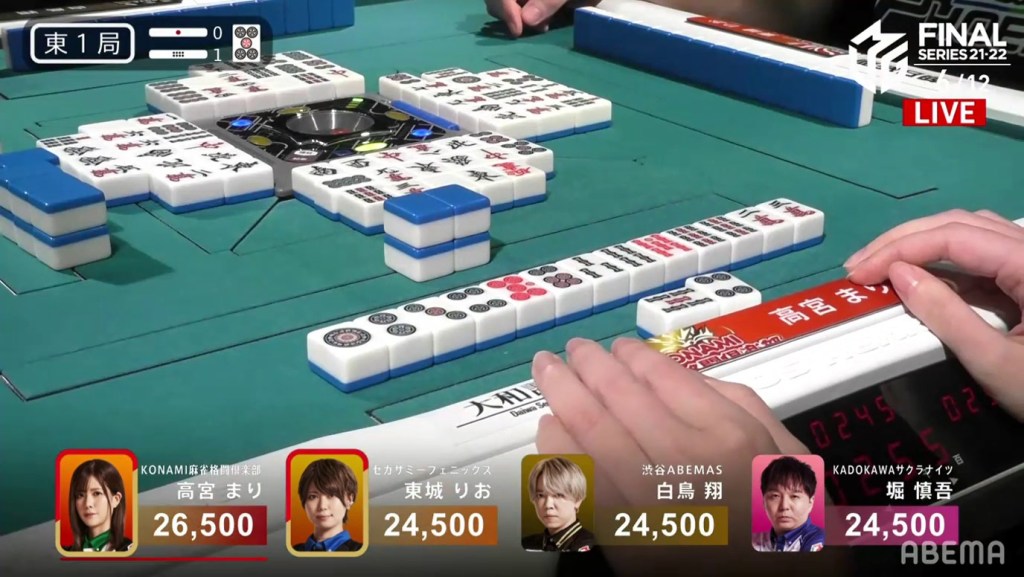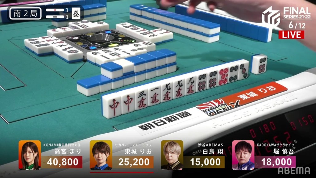 With two two-sided waits, it was anybody’s guess who would win. The 2nd row filled with more and more tiles, and they started going into the 3rd row. Then, on turn 17, Tojo draws and discard the 1m and deals into Takamiya. Takamiya wins the hand with Riichi/Pinfu/Dora 1/Aka 2 for 12,000+300, plus Tojo’s riichi stick.