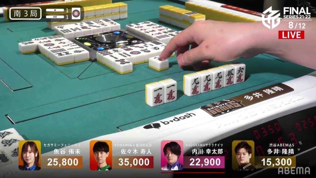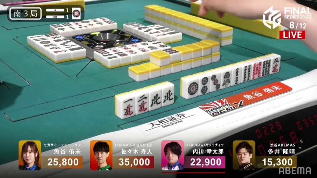 A few turns and calls later, Ooi gets to tenpai on a 47m ryanmen, the same as Uchikawa.