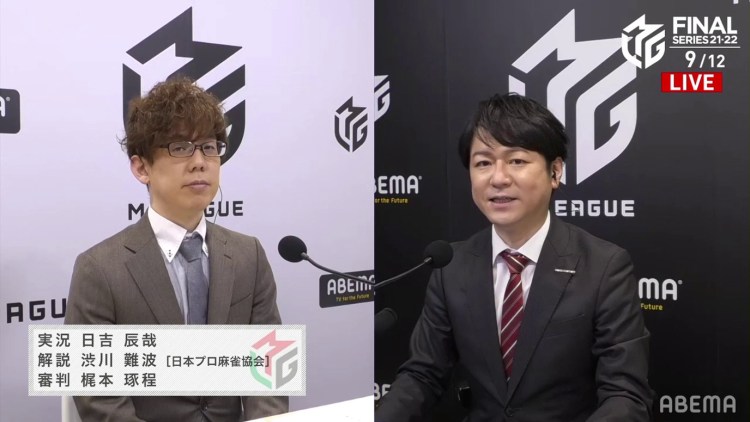 The commentator of the day was the always exciting Hiyoshi Tatsuya. Joining him was Shibukawa Nanba from Nihon Pro Mahjong (NPM). After a recap of the results on Friday, we took a look at the standings.