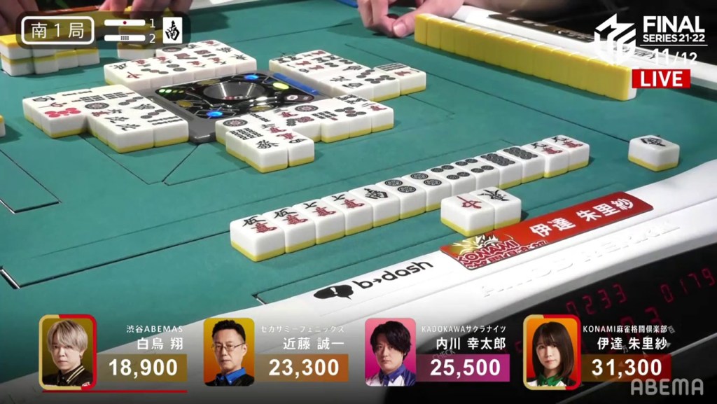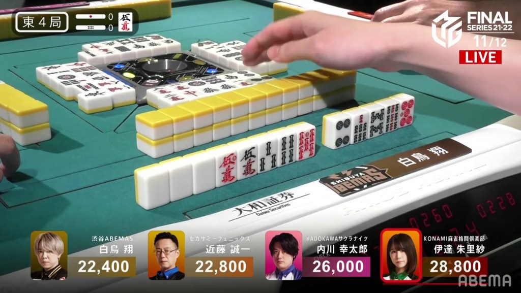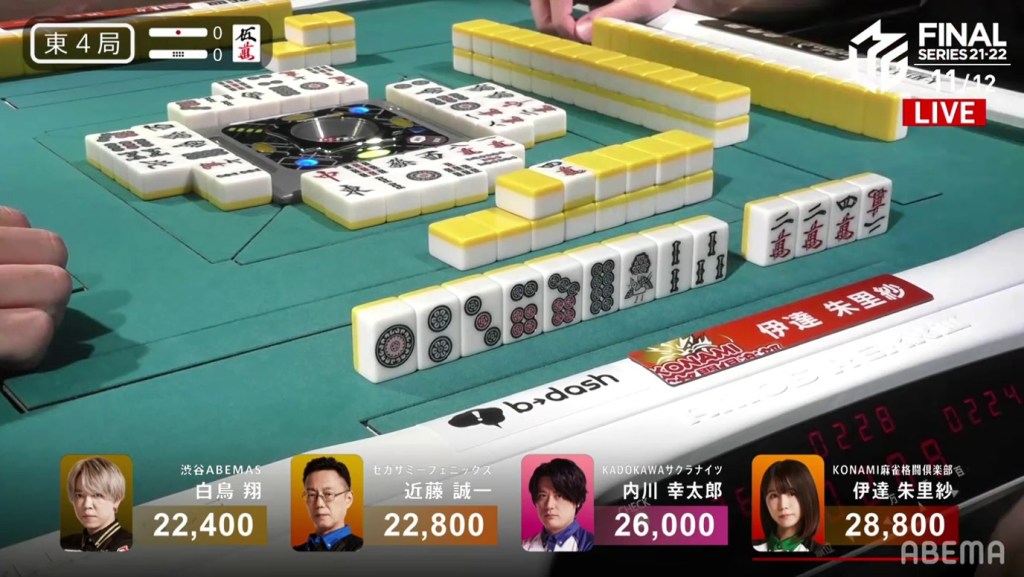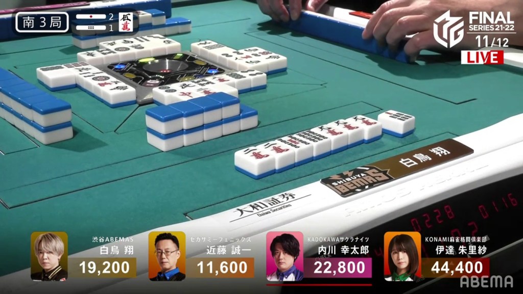 With each player trying to win their team the championship, they both put their fates to the wall. On turn 10, Kondo draws and discards the 6s, dealing into Shiraotri. Shiratori wins the hand with Riichi/Pinfu/Aka 1/Ura 1 for 8,00, plus Kondo’s riichi stick. With the win, Shiratori moves into 3rd place and comes within 1,600 for 2nd place.