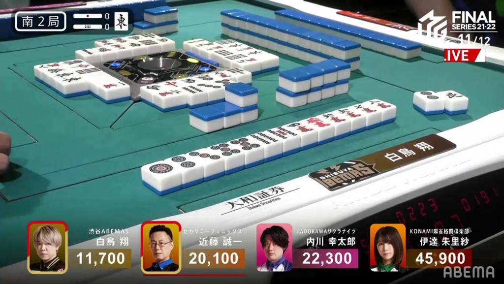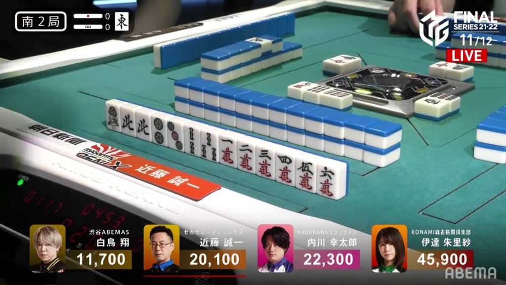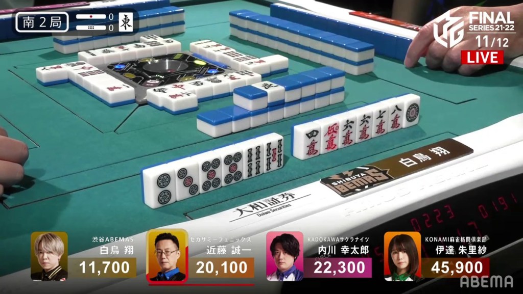 In S2-0, Shiratori is in 4th place after suffering the dealer penalty on Date’s haneman tsumo. Being 8,400 behind 3rd place, Shiratori starts the hand 3-shanten with two completed sequences and a red 5m. Within three turns, 3rd place Kondo causes problems for Shiratori when he calls riichi on a 14p ryanmen.