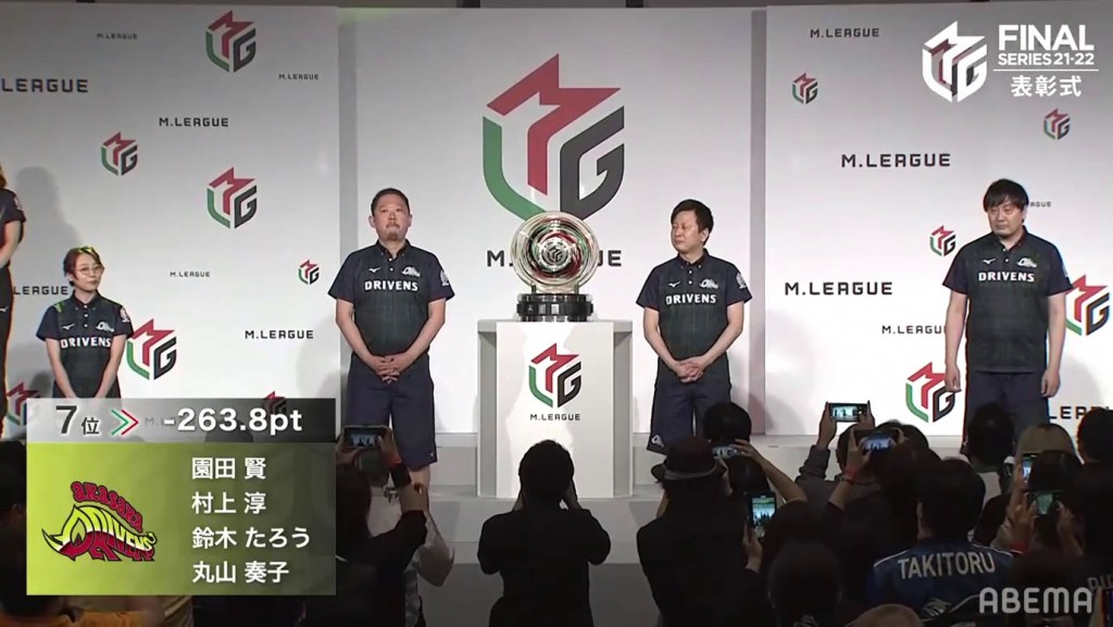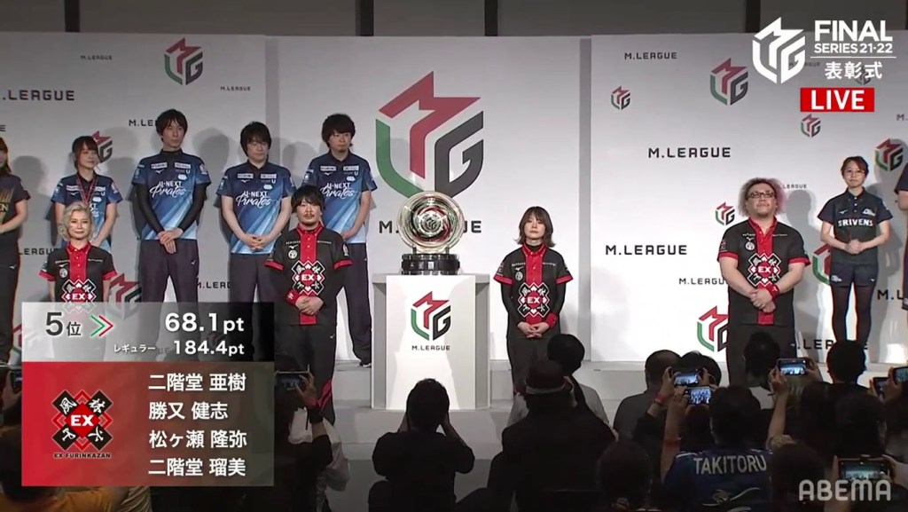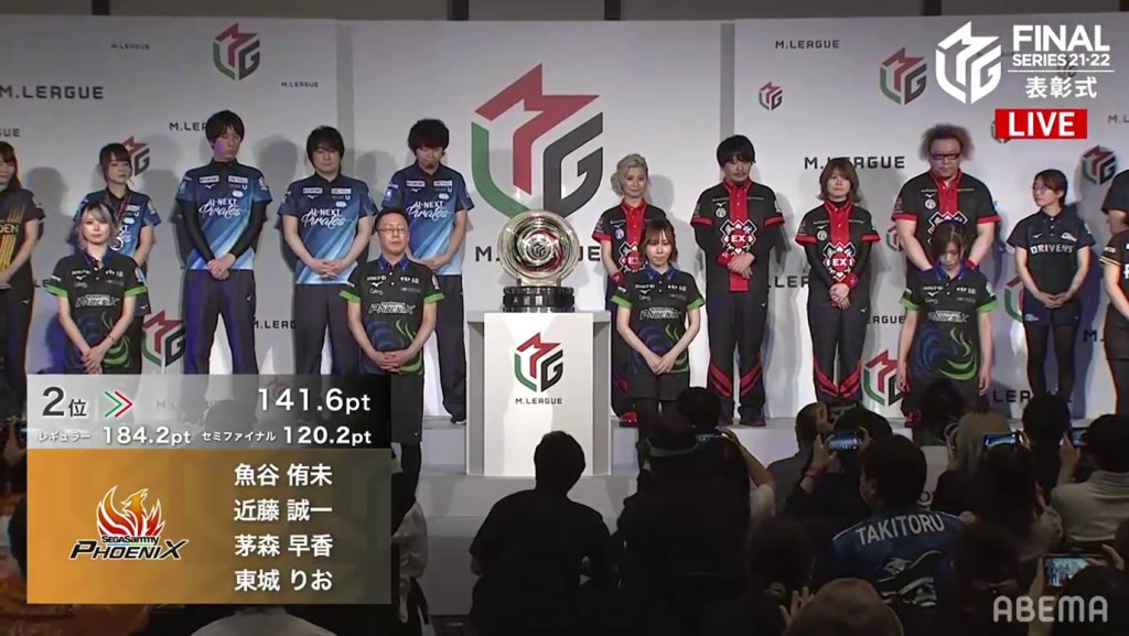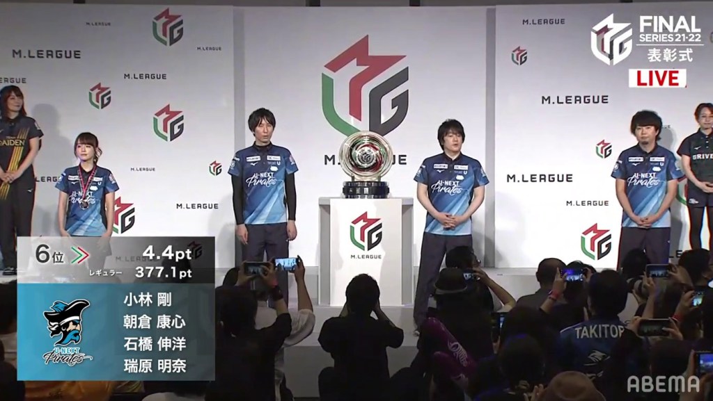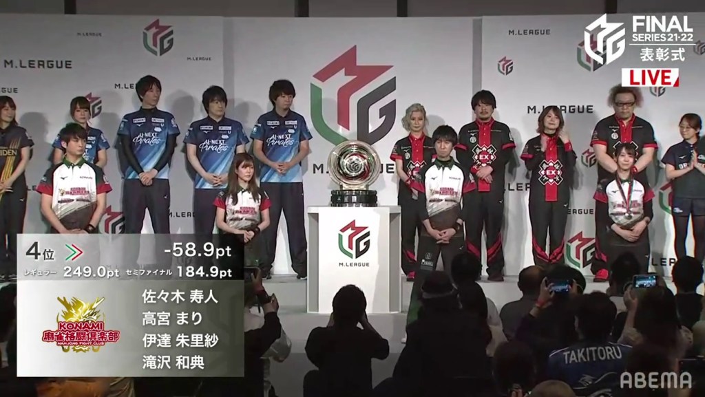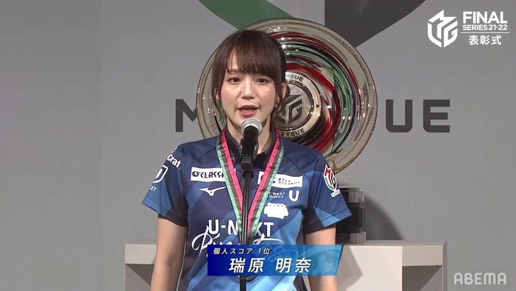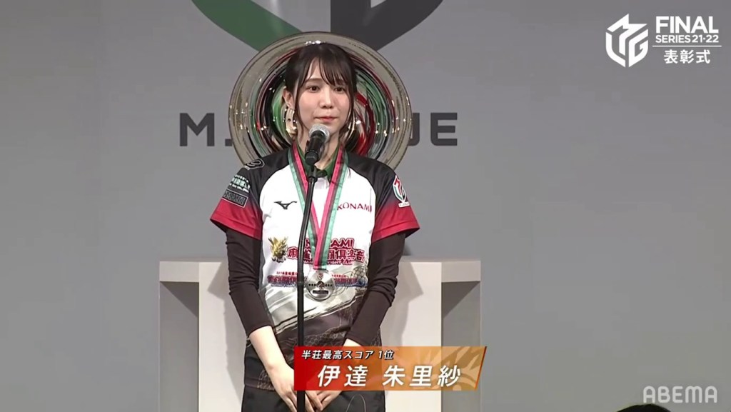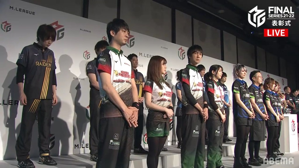 The third and final individual award was the Highest Season Score Award, also known as the MVP Award. This award is given to the player who has the highest cumulative score at the end of the regular season. With Mizuhara being the season’s MVP, she went on stage and received her medal, which looks like a small version of the M-League championship plate. After saying her speech, it was time for the team introductions and the final standings.