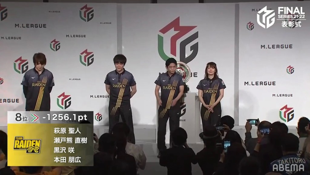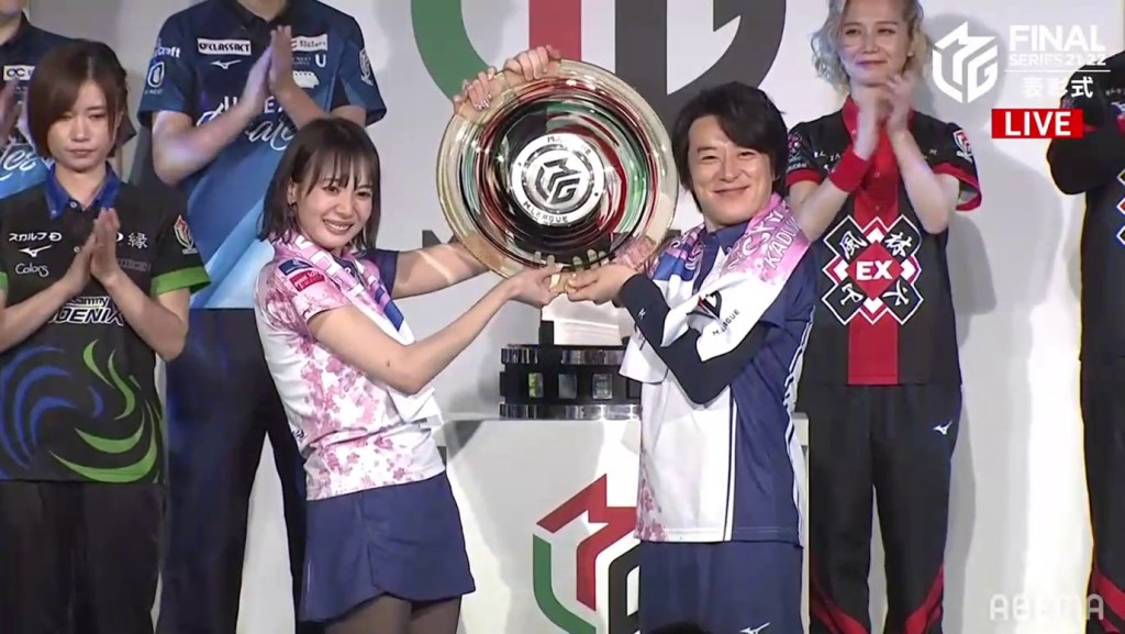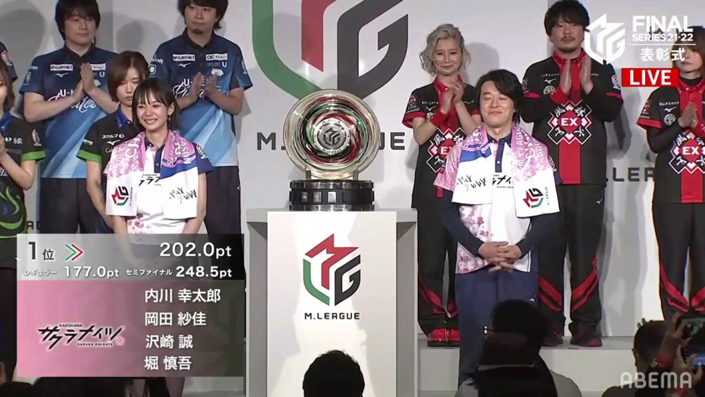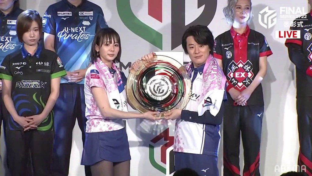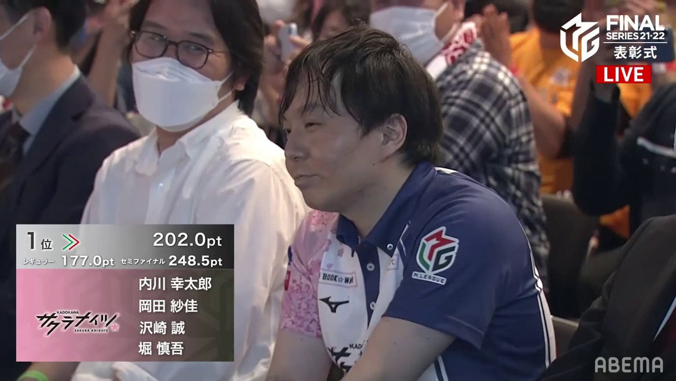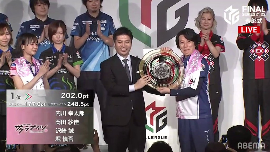 After the montage, the room was dark. As the lights gradually came on, the MC announced that this season’s champions are the Kadokawa Sakura Knights! The team went +177.0pts in the regular season, +248.5pts in the semifinals and +202.0pts in the finals. Okada Saki Sayaka and Uchikawa Kotaro went on stage with smiles on their faces, with Hori sitting in the front row (he wasn’t able to go on stage due to an injury). Sawazaki was unable to attend because of his recent hospitalization.
