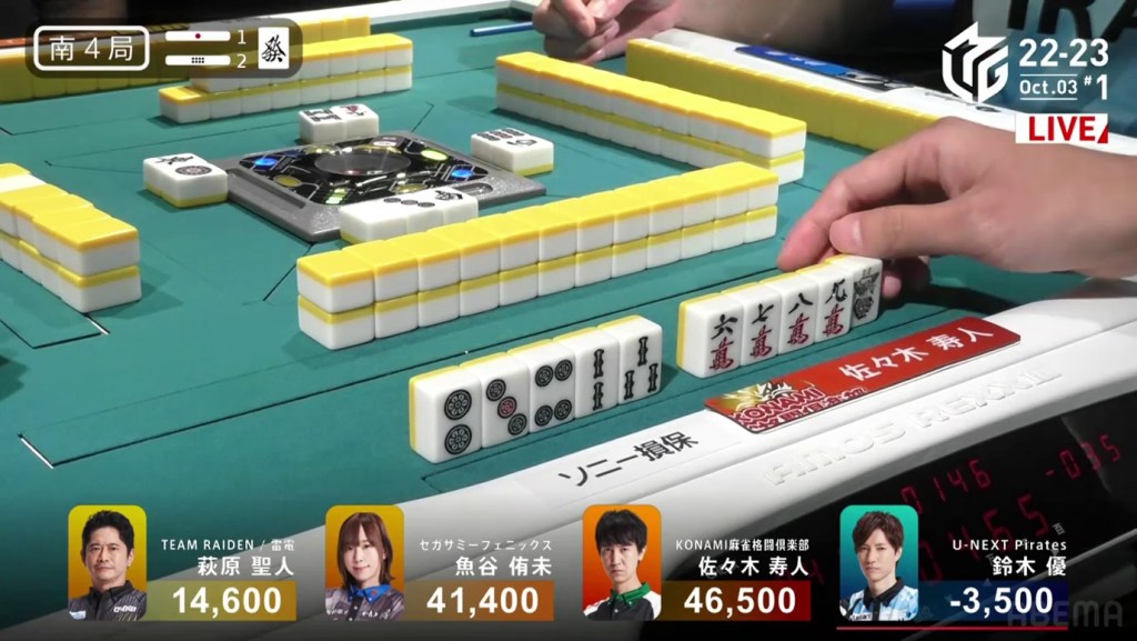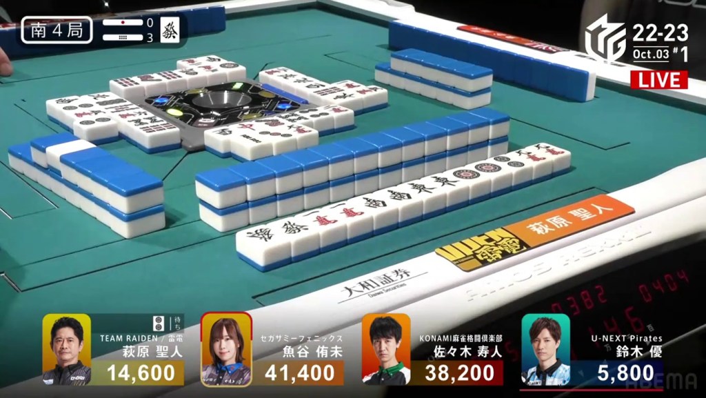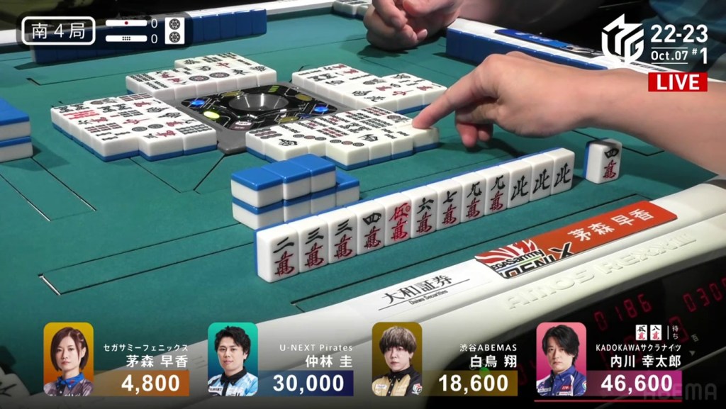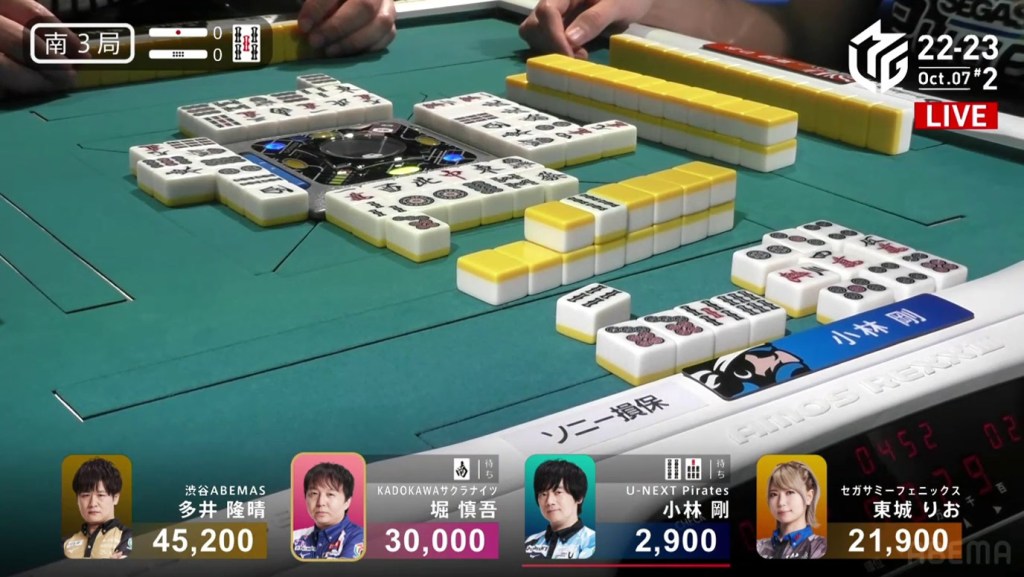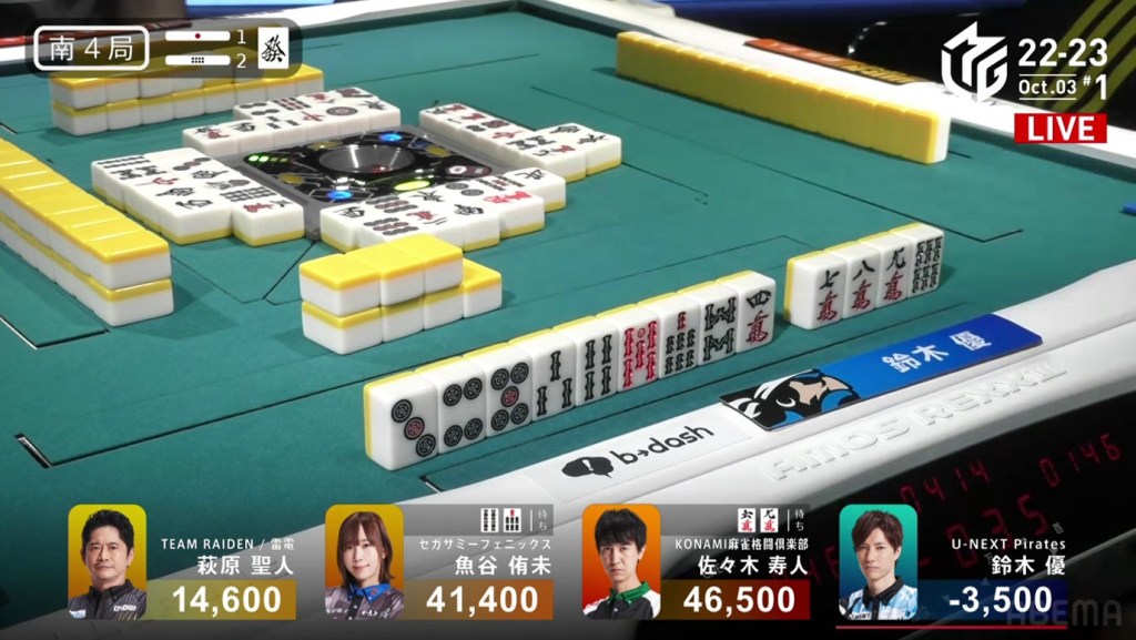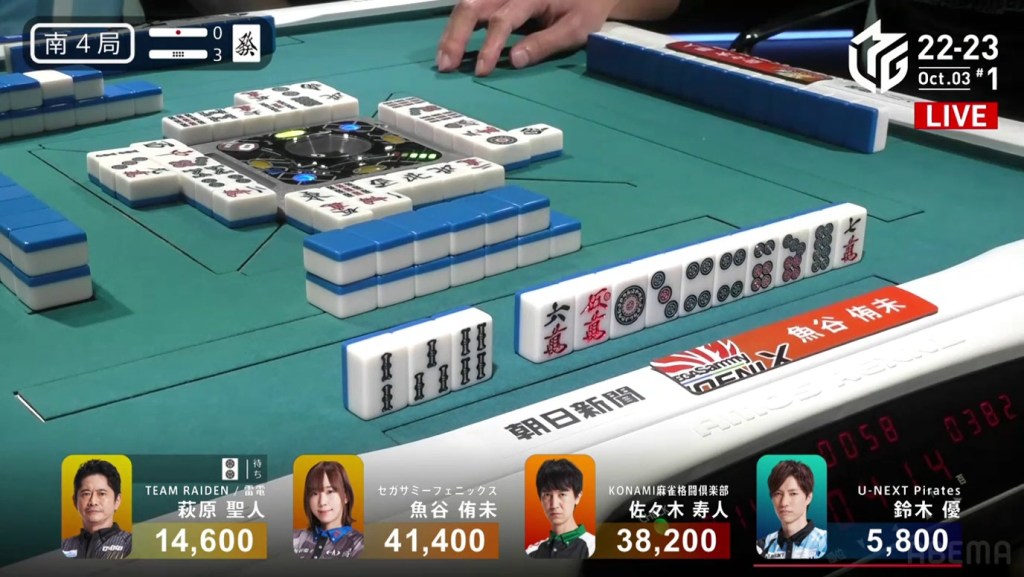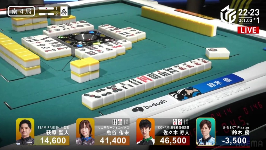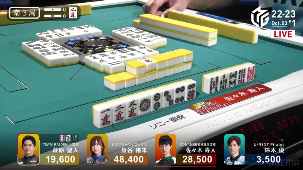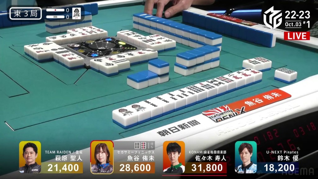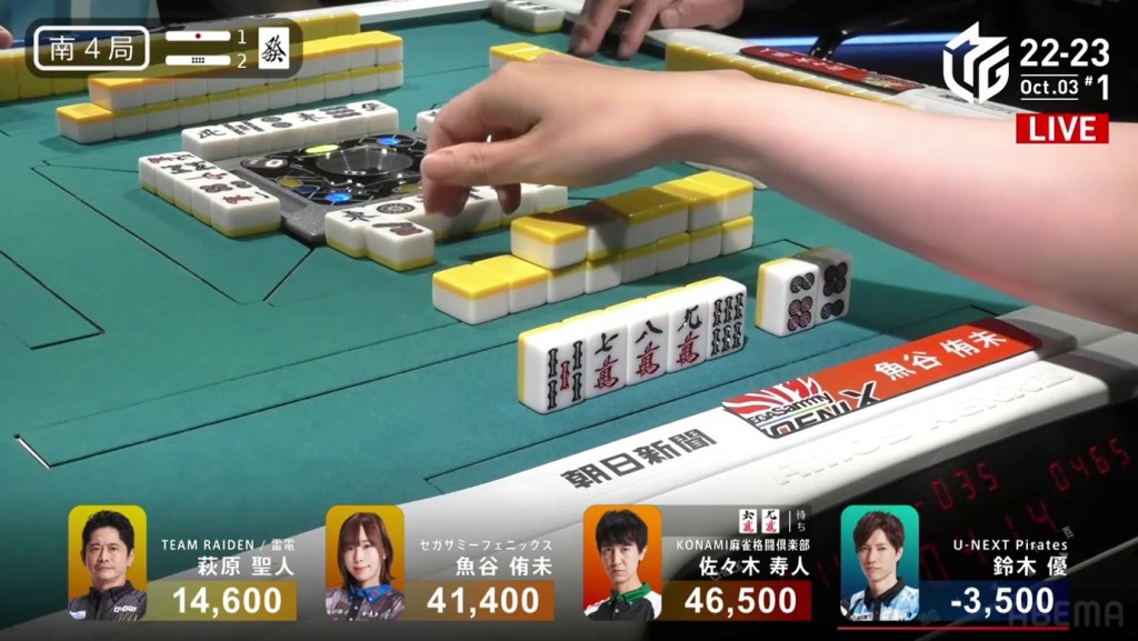 In the first game of the M-League 2022-23 season, the team captains of Team Raiden, Konami Mahjong Fight Club and Sega Sammy Phoenix faced off, along with newcomer Suzuki Yu of the U-Next Pirates. In E1-0, Hagiwara the dealer starts out iishanten, while Uotani is 3-shanten with two dora. On turn 3, Hagiwara switches out his 3m penchan for a 2p kanchan, but the move ends up backfiring on him just two turns later when he draws the 3m.