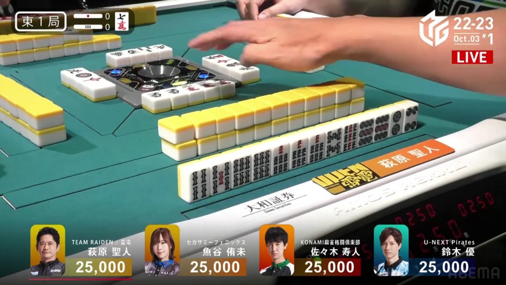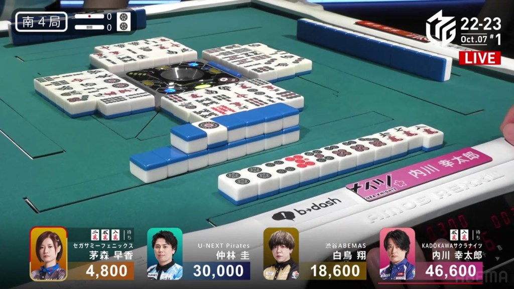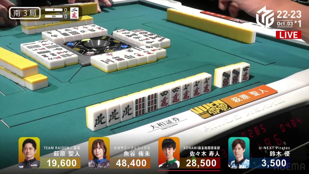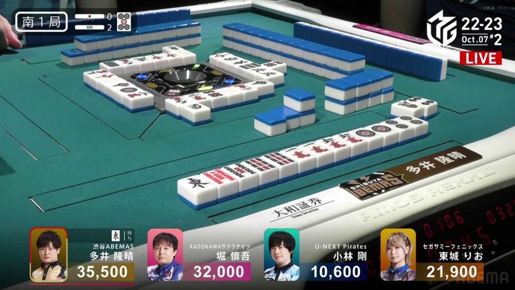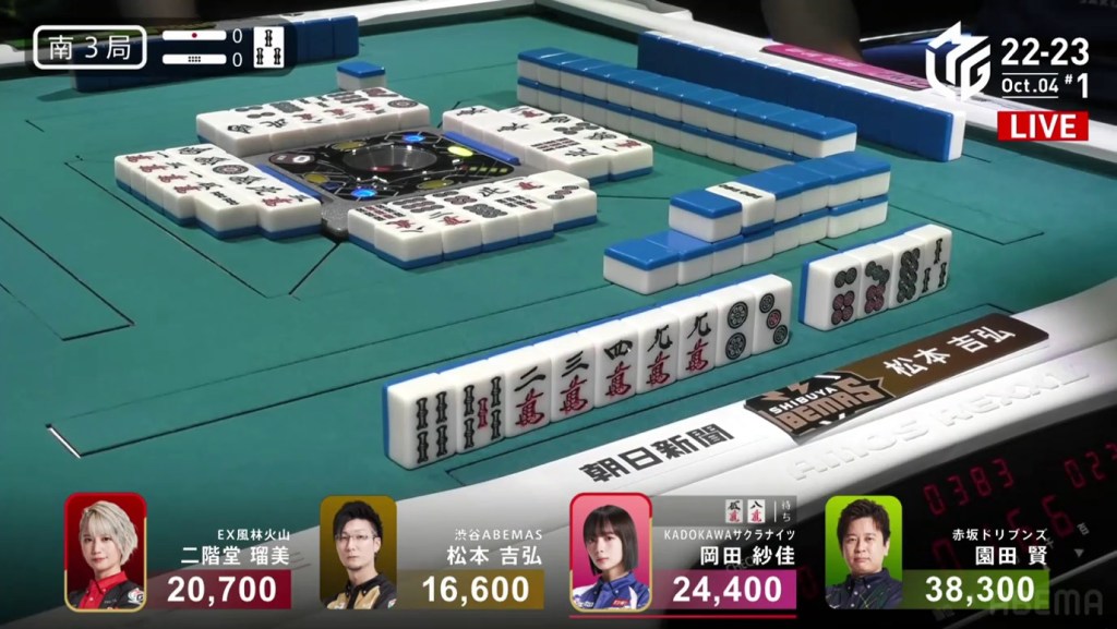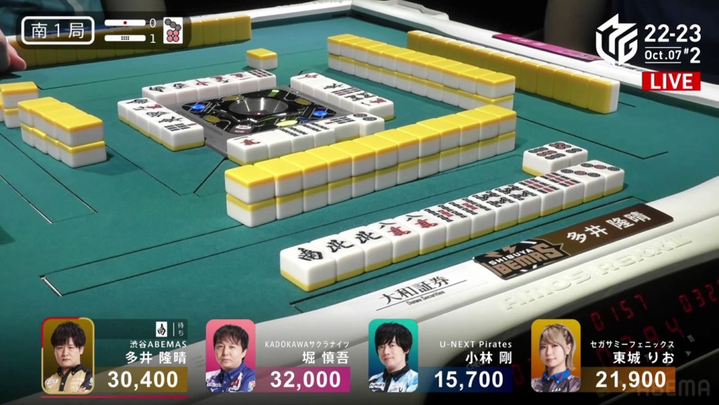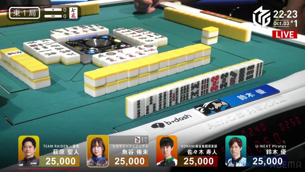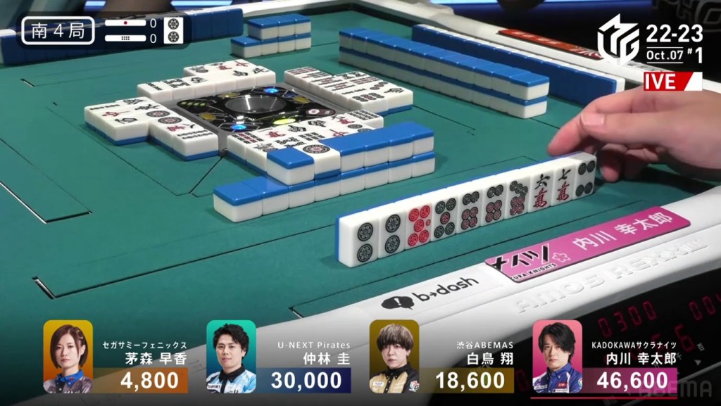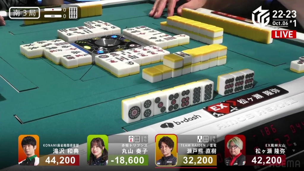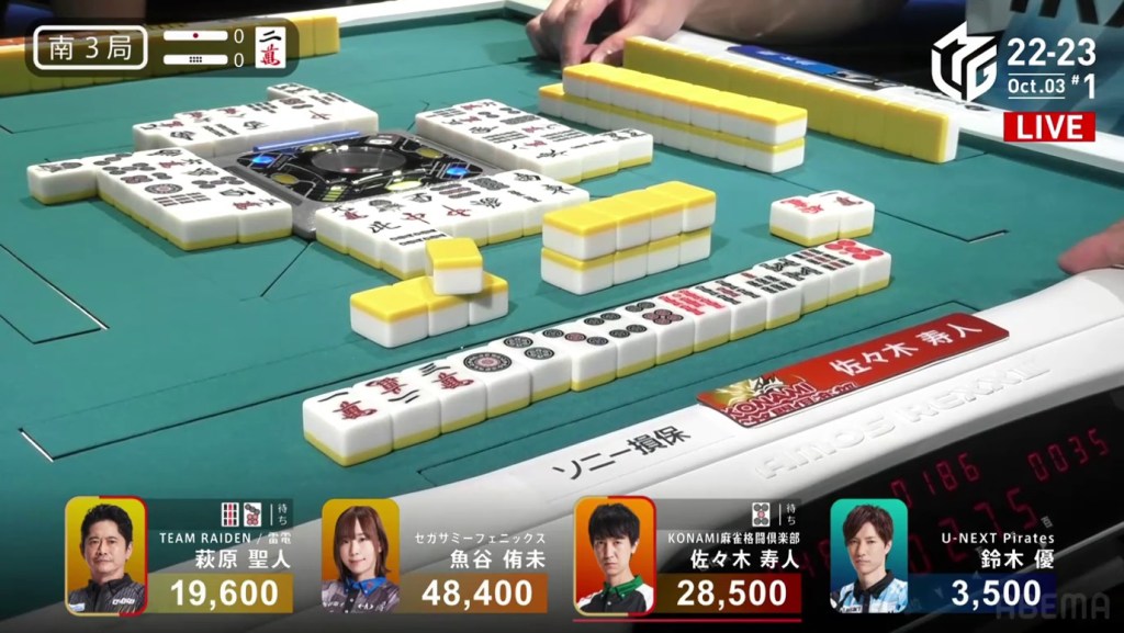 In the first game of the M-League 2022-23 season, the team captains of Team Raiden, Konami Mahjong Fight Club and Sega Sammy Phoenix faced off, along with newcomer Suzuki Yu of the U-Next Pirates. In E1-0, Hagiwara the dealer starts out iishanten, while Uotani is 3-shanten with two dora. On turn 3, Hagiwara switches out his 3m penchan for a 2p kanchan, but the move ends up backfiring on him just two turns later when he draws the 3m.