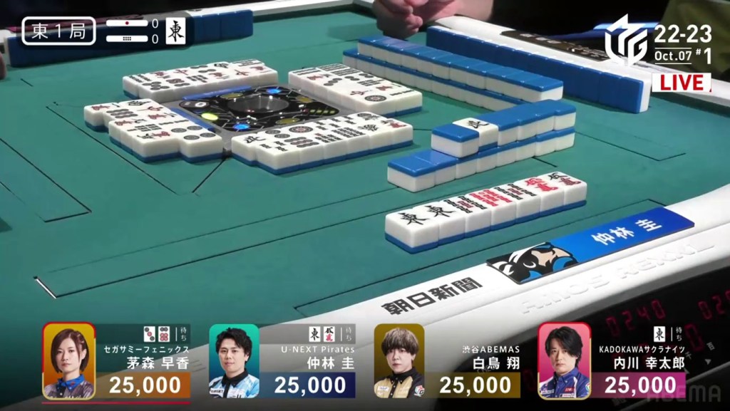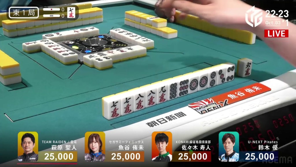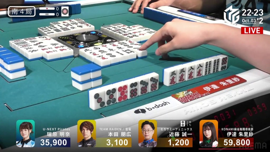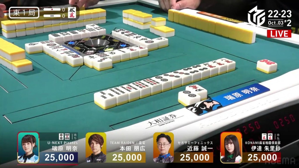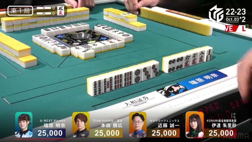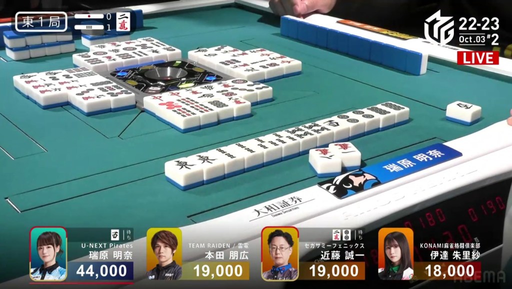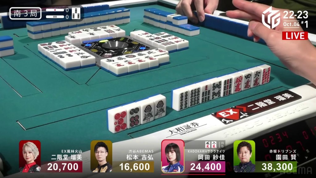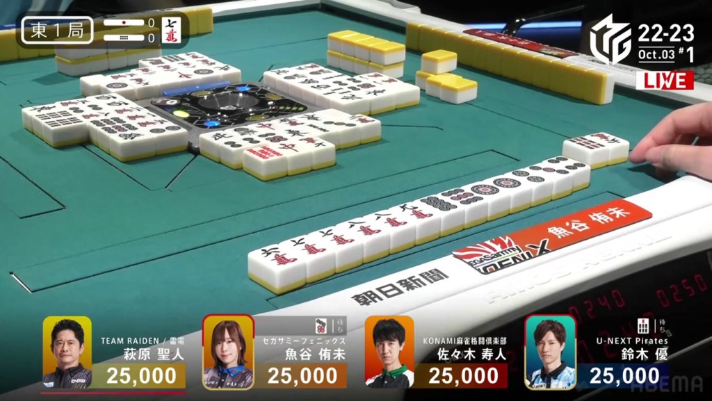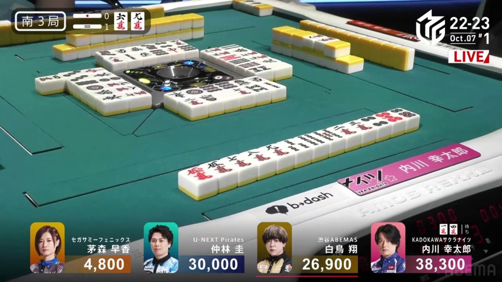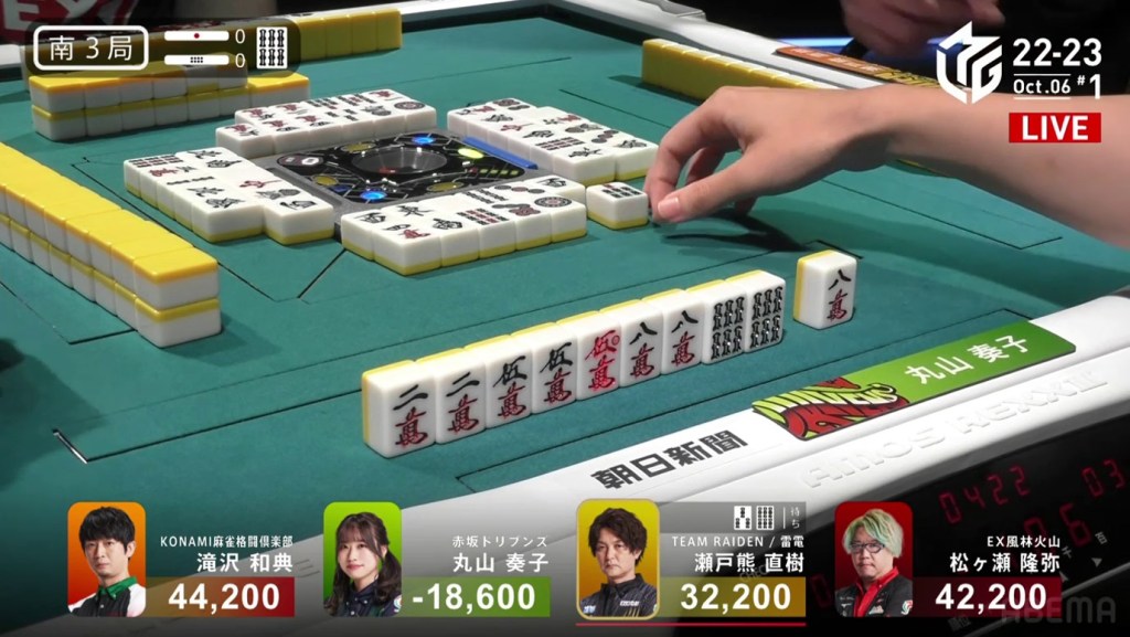 In the first game of the M-League 2022-23 season, the team captains of Team Raiden, Konami Mahjong Fight Club and Sega Sammy Phoenix faced off, along with newcomer Suzuki Yu of the U-Next Pirates. In E1-0, Hagiwara the dealer starts out iishanten, while Uotani is 3-shanten with two dora. On turn 3, Hagiwara switches out his 3m penchan for a 2p kanchan, but the move ends up backfiring on him just two turns later when he draws the 3m.