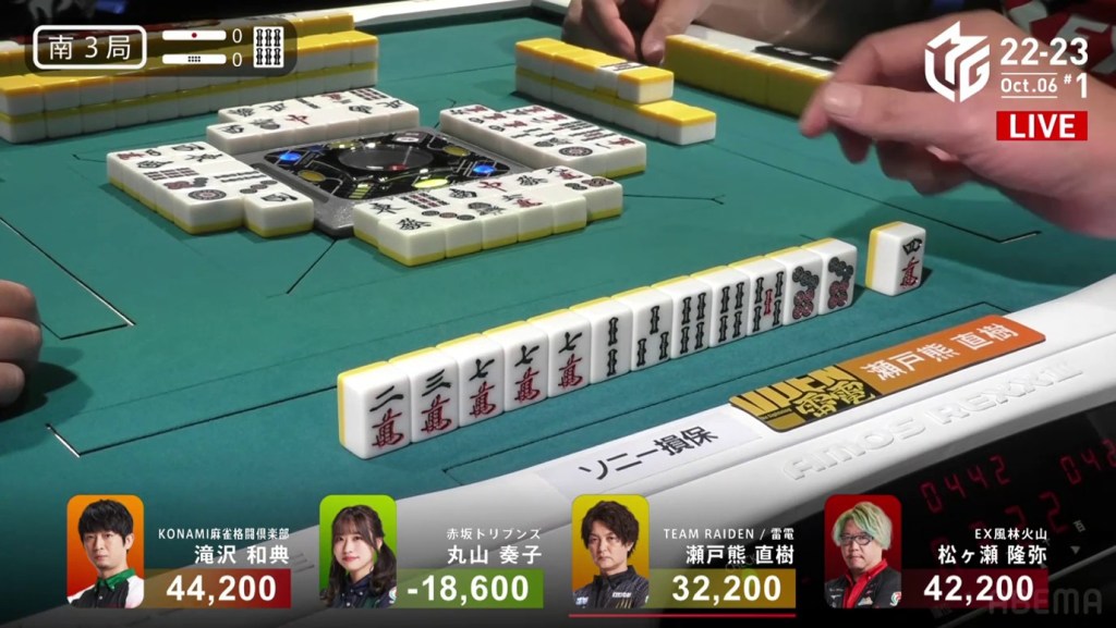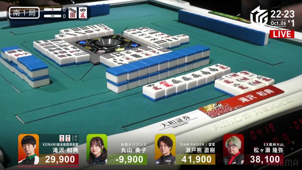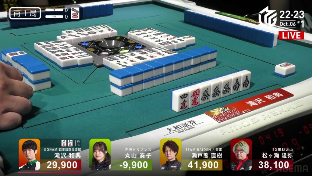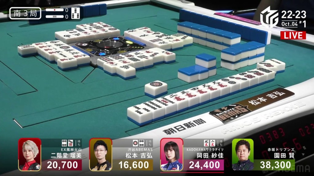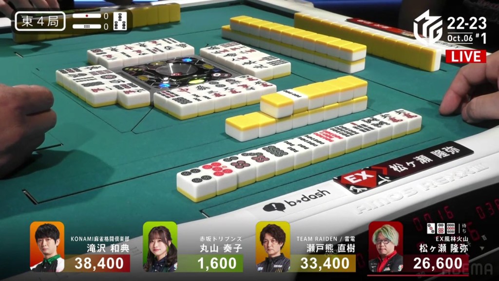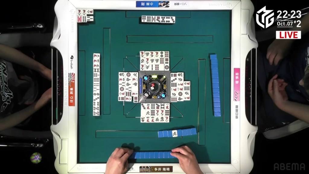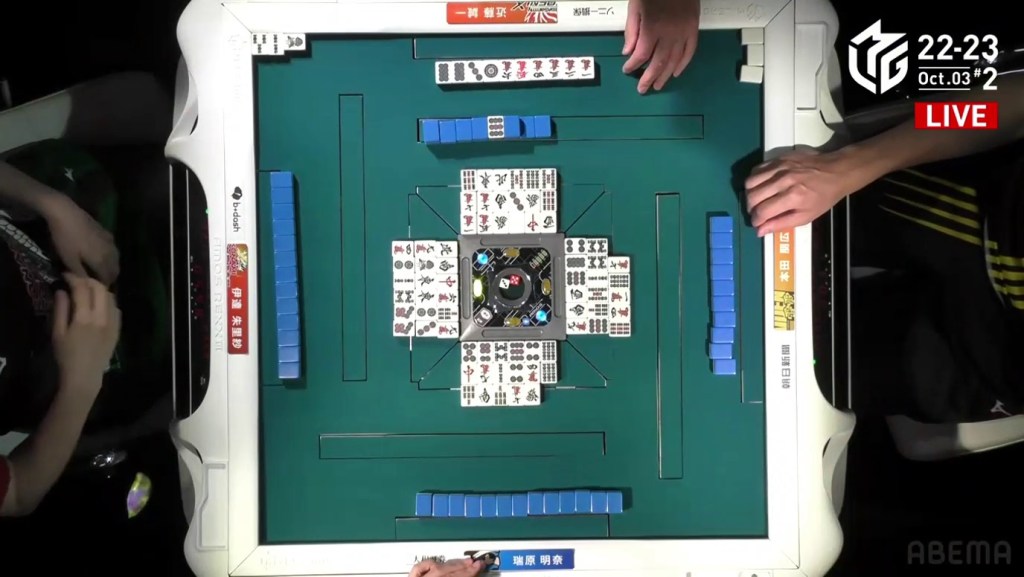 The game was paused temporarily, three pings were sounded and a voice started speaking overhead. Because Takizawa revealed two tiles from the wall, he was issued a yellow card. If Takizawa were to receive another yellow card during the game, then -20 would be deducted from his individual score (and thus his team’s total). The knocked-over tiles were placed back in their spots, Takizawa completed his pon and the game continued.