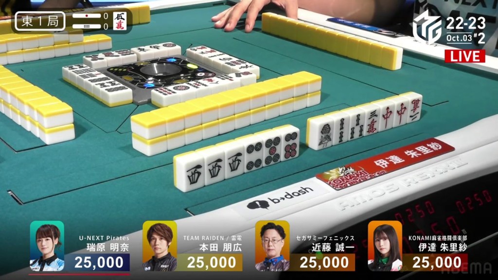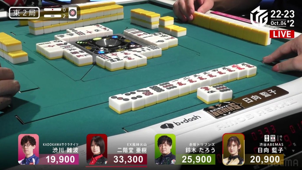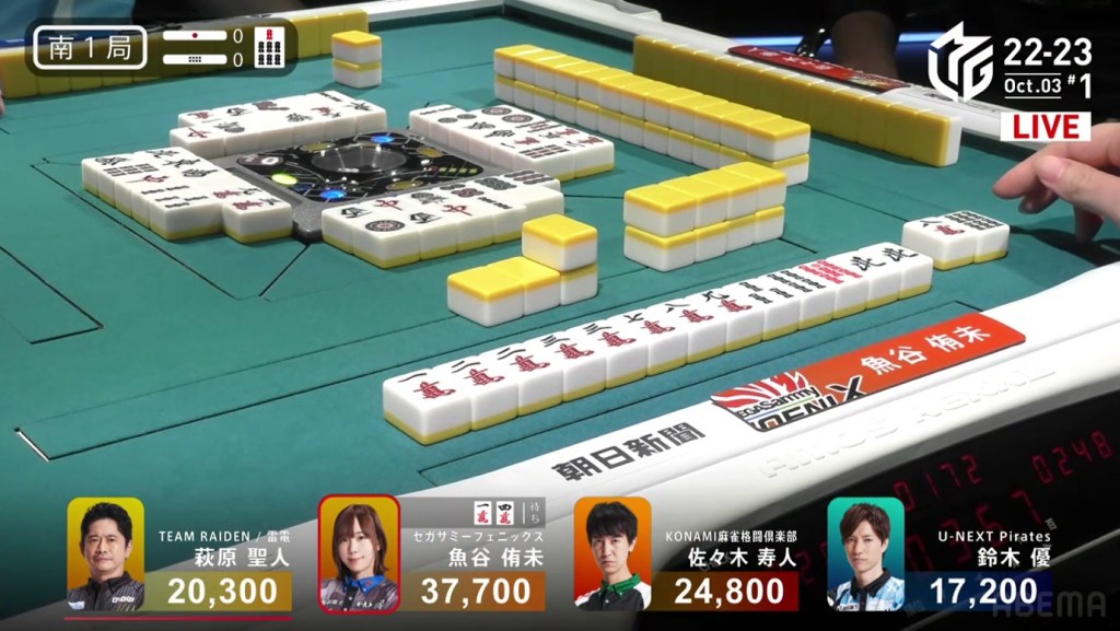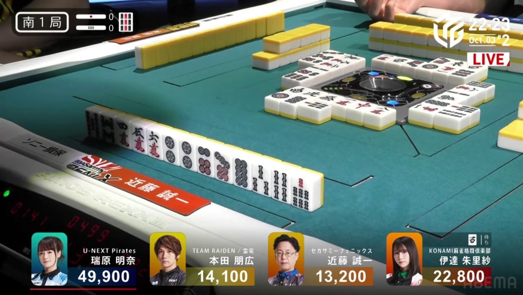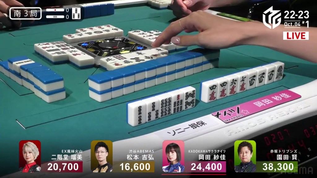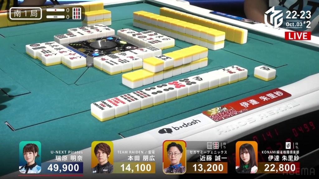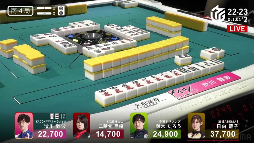 The game was paused temporarily, three pings were sounded and a voice started speaking overhead. Because Takizawa revealed two tiles from the wall, he was issued a yellow card. If Takizawa were to receive another yellow card during the game, then -20 would be deducted from his individual score (and thus his team’s total). The knocked-over tiles were placed back in their spots, Takizawa completed his pon and the game continued.