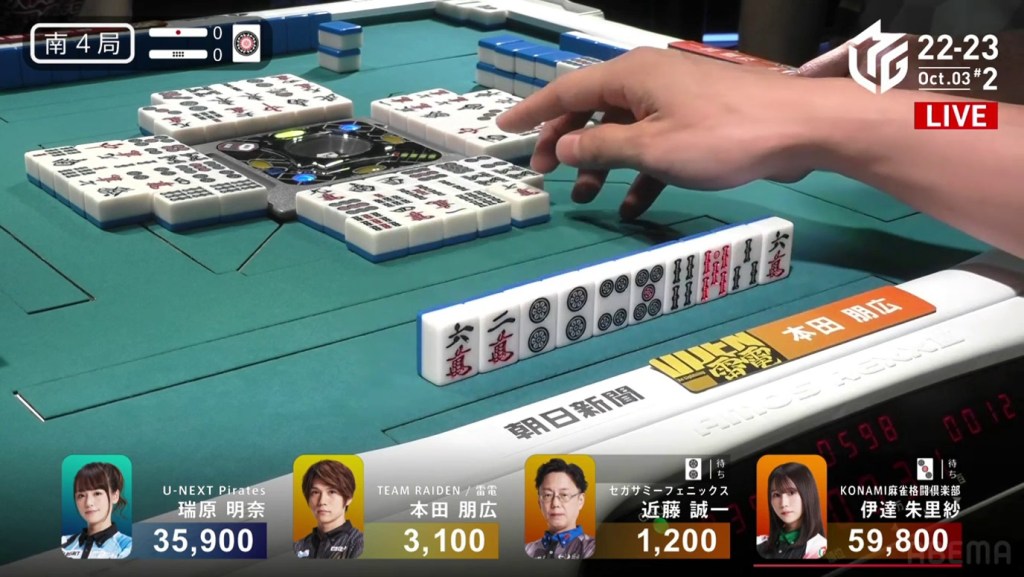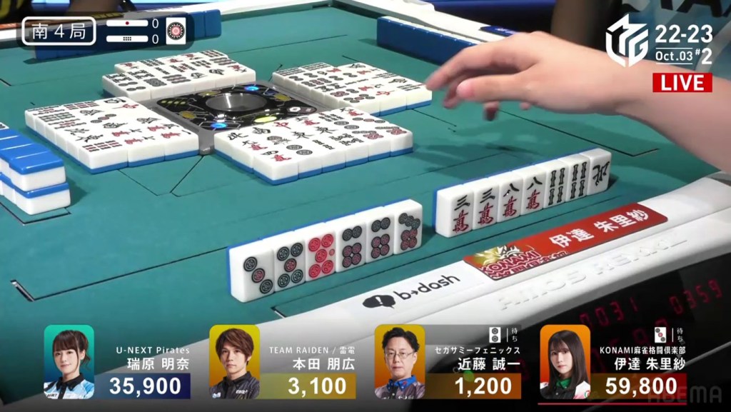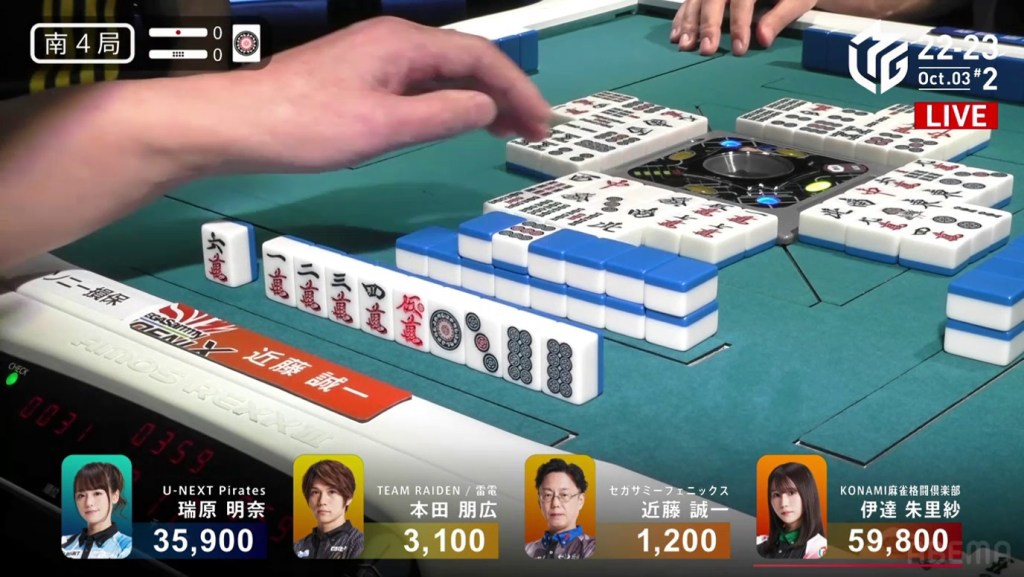 On the ippatsu turn, Mizuhara draws the red 5p and calls tsumo. Flipping two uradora, Mizuhara wins with Riichi/Ippatsu/Tsumo/Pinfu/Aka 1/Ura 2 for 6,000 all (plus Date’s riichi stick) to put her firmly in first place.