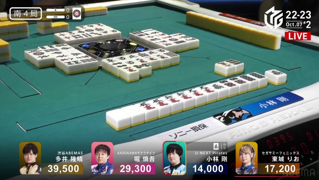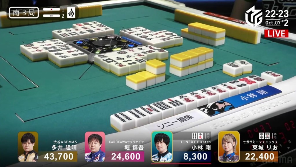 In S3-0, Kobayashi is in 4th place and 19,000 behind 3rd place. Being the face of 4th place avoidance, his current standing does not bode well for his image. However, his current dealer turn is the perfect time to turn things around. He starts out 4-shanten from the start, for both a standard hand and chiitoi, but a few tanyao calls put him iishanten in the middle of the 2nd row. Even with Hori’s riichi, Kobayashi pushed on. After a 3rd call and some wait shifting, Kobayashi settled on a 47s ryanmen, which Hori ended up throwing in to. Kobayashi wins the hand with Tanyao/Dora 1 for 2,900 (plus Hori’s riichi stick).