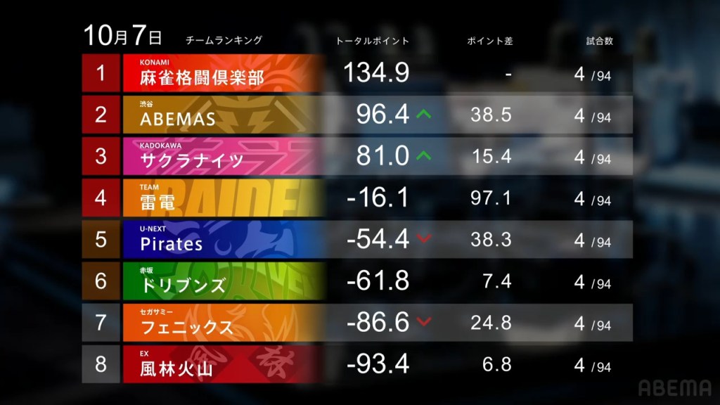 And finally, in last place, we have the U-Next Pirates. It was the UK duo (Suzuki Yu and Nakabayashi Kei) and it seemed like they were still adjusting. They weren’t able to go on big dealer repeats like their opponents and lost points on tsumo. Their -135.6pts and 0/1/1/2 record this week could be considered an off-week, but it still puts the team in 8th place and still without a 1st place.