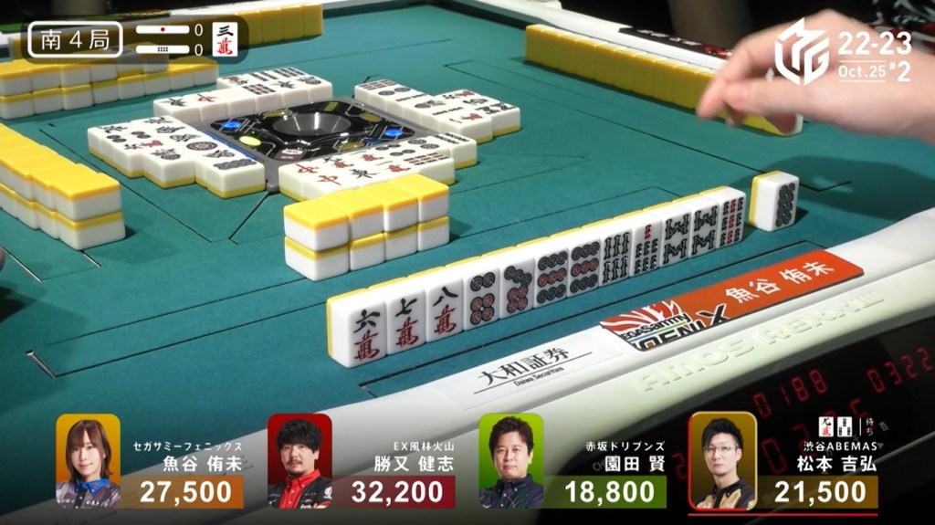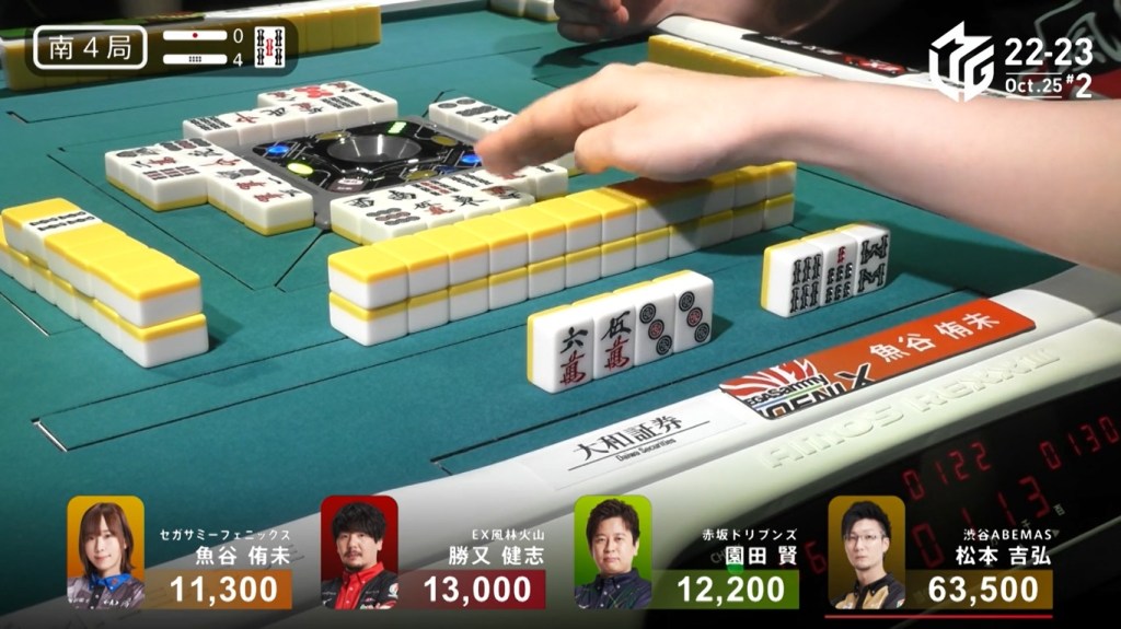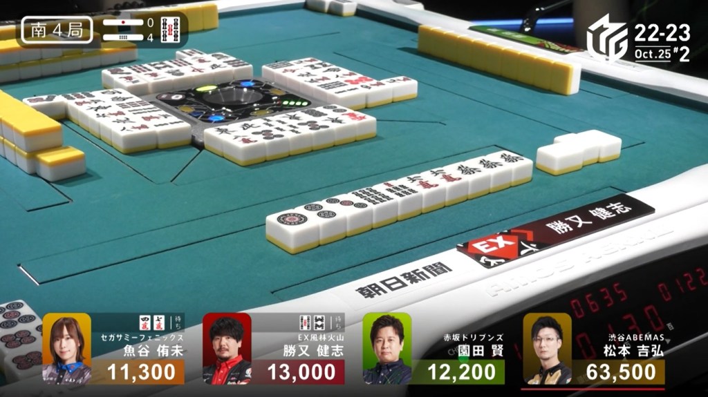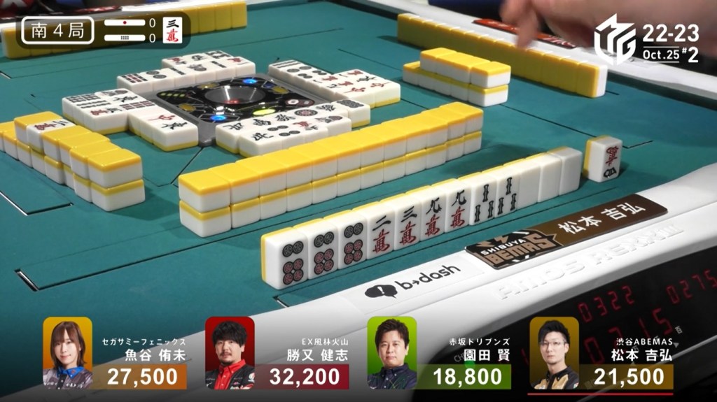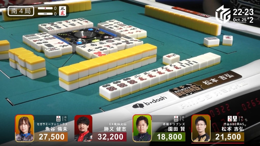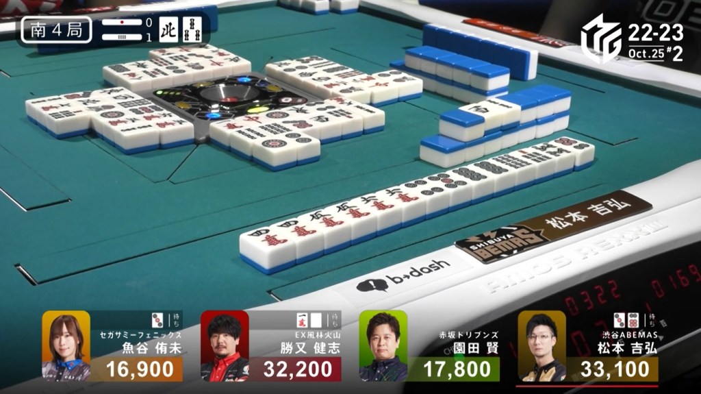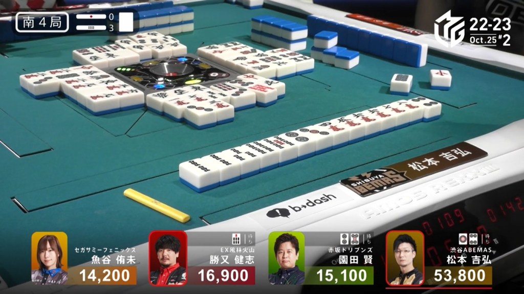 In S4-0, Matsumoto is the dealer and sitting in 3rd place, 2,700 ahead of 4th. So far, the Shibuya Abemas have gone the whole season without a last and they don’t want to start now. He starts out 4-shanten with a pair of white dragons and a 3m dora. In the first row, he makes the white dragon an ankou, creates another ankou, creates a pair and gets to iishanten by the end of it. In the middle of the 2nd row, Matsumoto gets to tenpai and calls riichi on a 3s/9m shanpon.