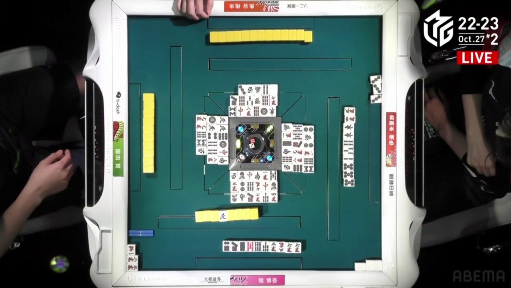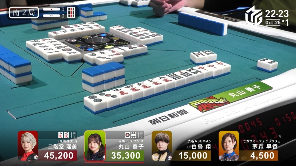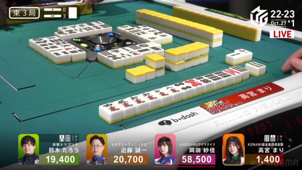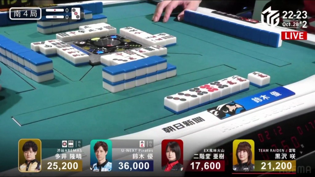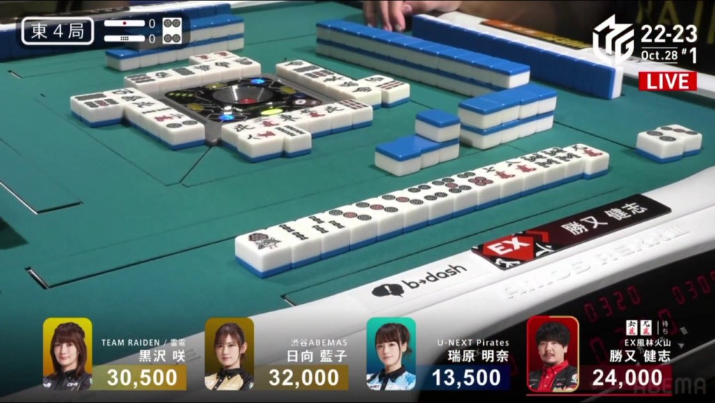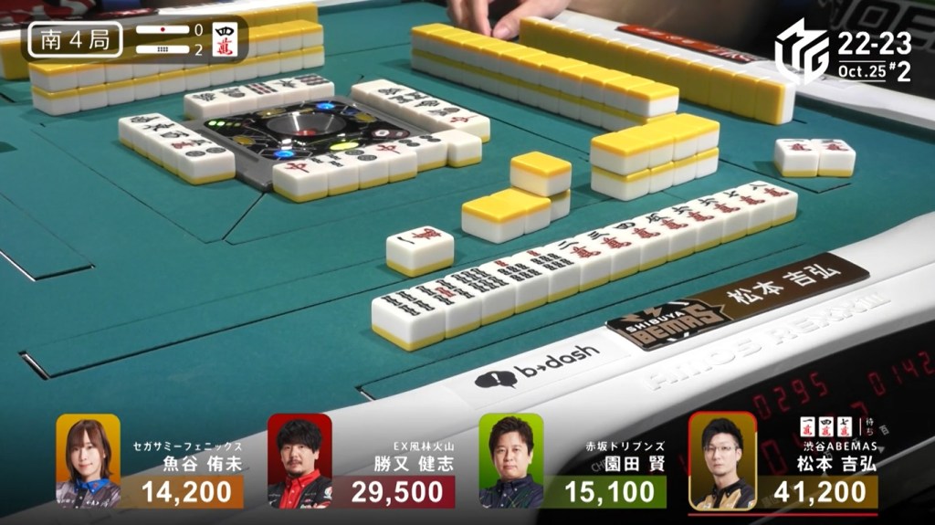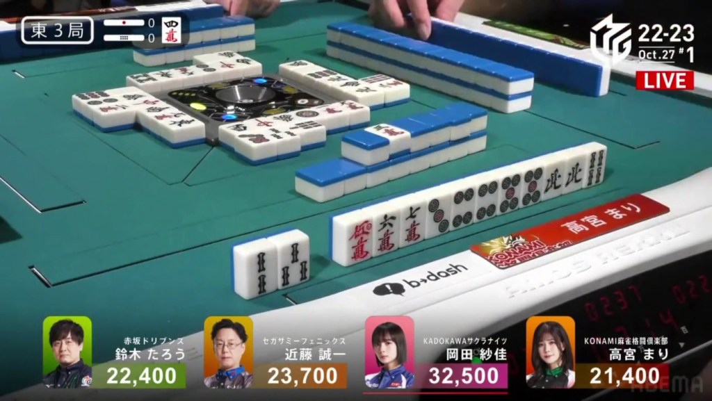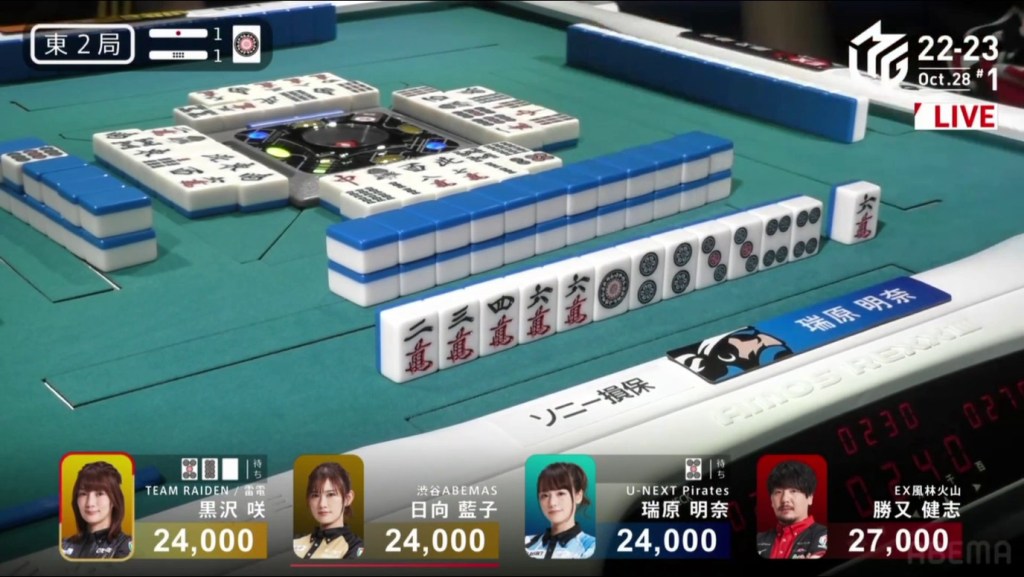 In S4-0, Matsumoto is the dealer and sitting in 3rd place, 2,700 ahead of 4th. So far, the Shibuya Abemas have gone the whole season without a last and they don’t want to start now. He starts out 4-shanten with a pair of white dragons and a 3m dora. In the first row, he makes the white dragon an ankou, creates another ankou, creates a pair and gets to iishanten by the end of it. In the middle of the 2nd row, Matsumoto gets to tenpai and calls riichi on a 3s/9m shanpon.