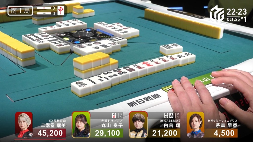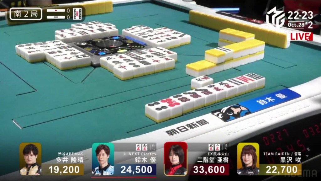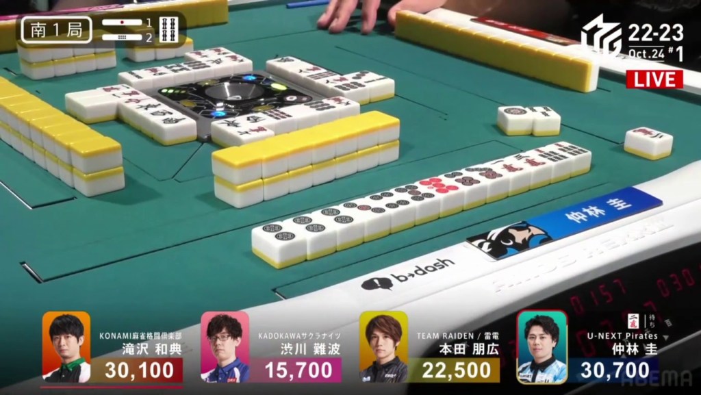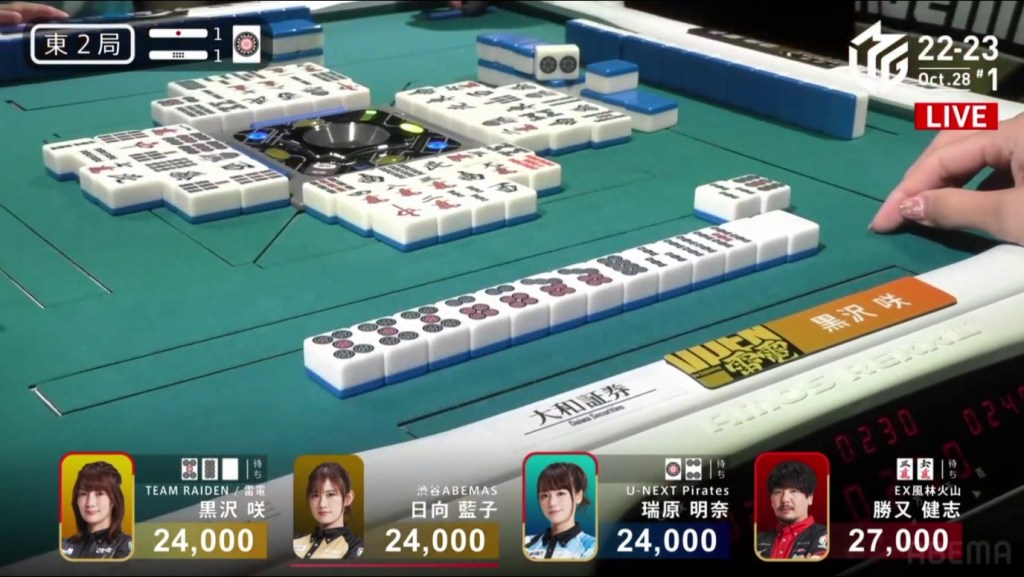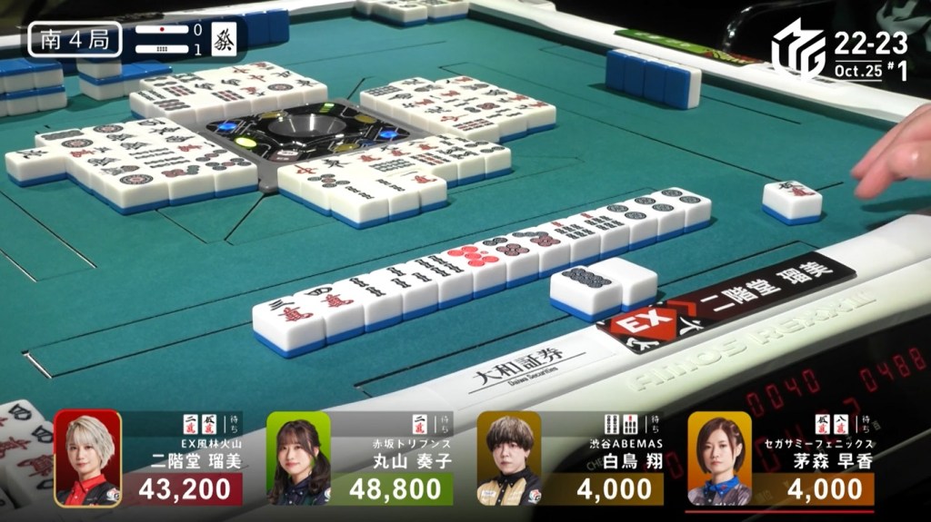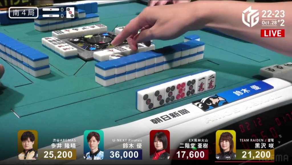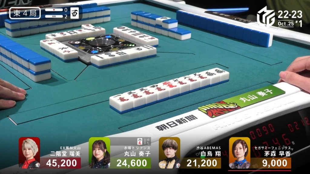 In S4-0, Matsumoto is the dealer and sitting in 3rd place, 2,700 ahead of 4th. So far, the Shibuya Abemas have gone the whole season without a last and they don’t want to start now. He starts out 4-shanten with a pair of white dragons and a 3m dora. In the first row, he makes the white dragon an ankou, creates another ankou, creates a pair and gets to iishanten by the end of it. In the middle of the 2nd row, Matsumoto gets to tenpai and calls riichi on a 3s/9m shanpon.