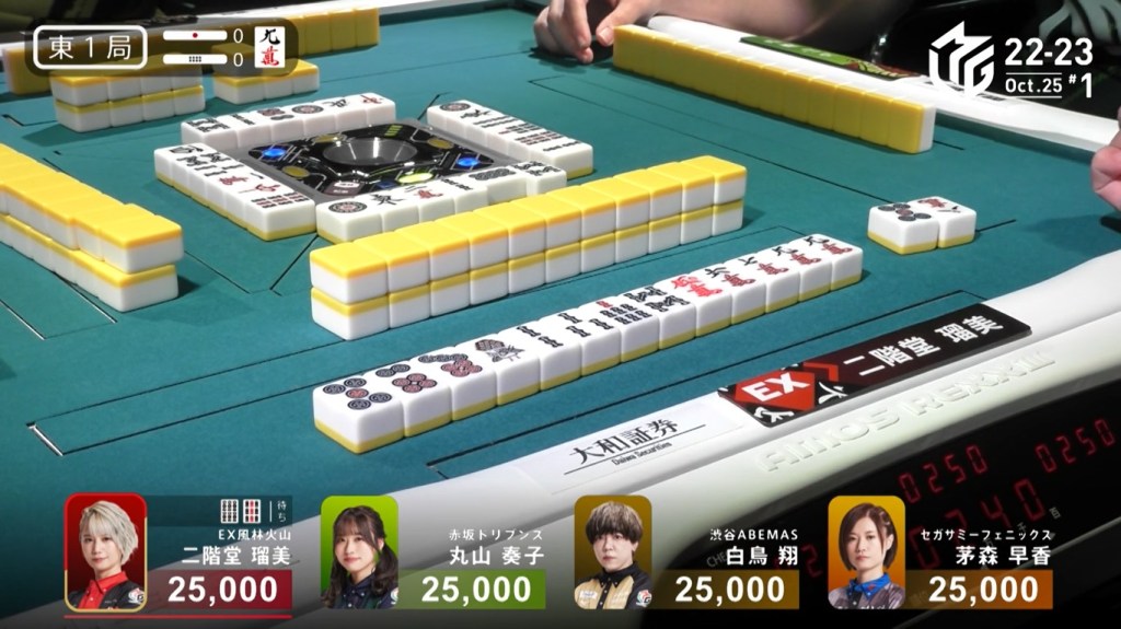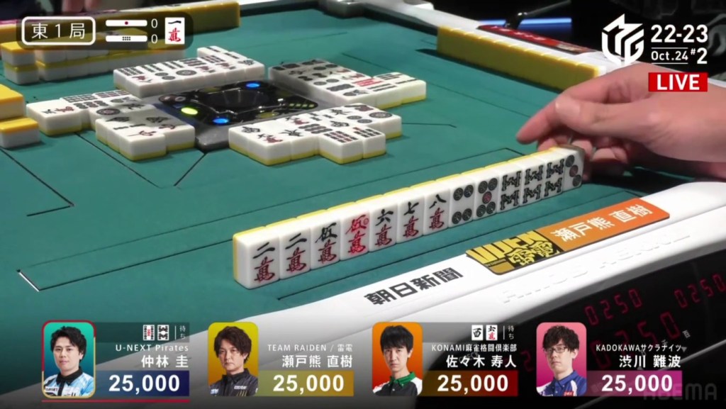 In E1-0, Nakabayashi, Setokuma, Hisato and Shibukawa face off against each other in the second game of the day. At the start, Hisato is the closest to tenpai at 2-shanten, followed by Setokuma at 3-shanten. In the first row, Nakabayashi makes good progress, getting to 2-shanten, while Shibukawa gets to iishanten with two kanchans. The first of the group to get to tenpai is Nakabayashi who calls riichi in the middle of the 2nd row with a 58s ryanmen.