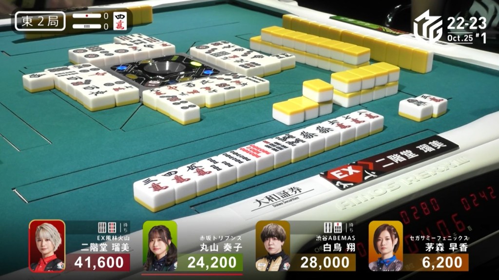 In S4-1, 5,600 separates Maruyama and Rumi, while Shiratori and Kayamori are tied for 3rd/4th. With this hand likely being the last, any deal-in and win is important. Rumi starts 3-shanten for chiitoi (4-shanten for a standard) with a red 5p, while Maruyama is 4-shanten with a red 5m. With both Shiratori and Kayamori at 5-shanten, the hand was likely going to be a fight between the front-runners. At the end of the 1st row, Rumi leads at iishanten, while Maruyama lags behind at 2-shanten. In the middle of the 2nd row, Rumi is the first to get to tenpai. With her hand currently worth 5,200, she would either need to win by tsumo, hit Maruyama directly or find one more han. With the riichi, Maruyama makes a passive call to get to iishanten, but is prepared to fold if she needs to. Throughout the rest of the 2nd and into the 3rd row, calls were made to get the other players close to tenpai. In the middle of the 3rd row, Maruyama called pon on her west wind to get to tenpai on a 58m nobetan, which she later switches to a 2m tanki. With each draw, the wall got shorter and shorter. Then, on Rumi’s last draw, she finds her winning 5m. Rumi wins the hand with Riichi/Tsumo/Tanyao/Aka 1 for 2,000+100/4,000+100, winning the game.